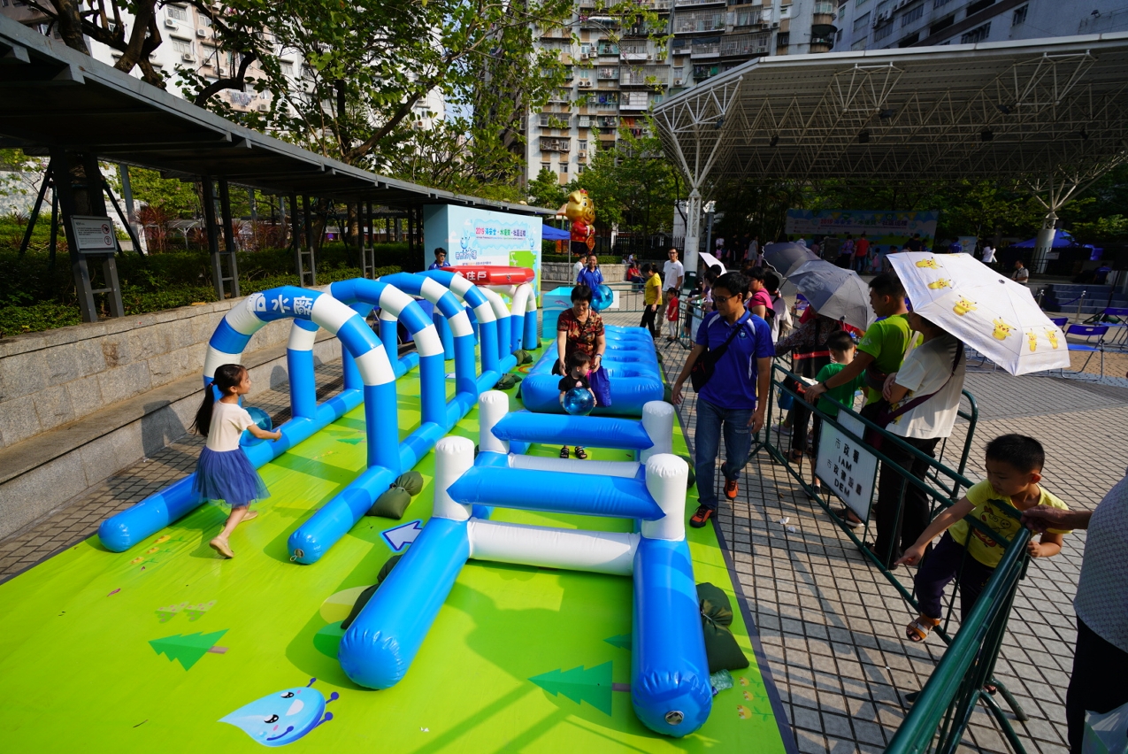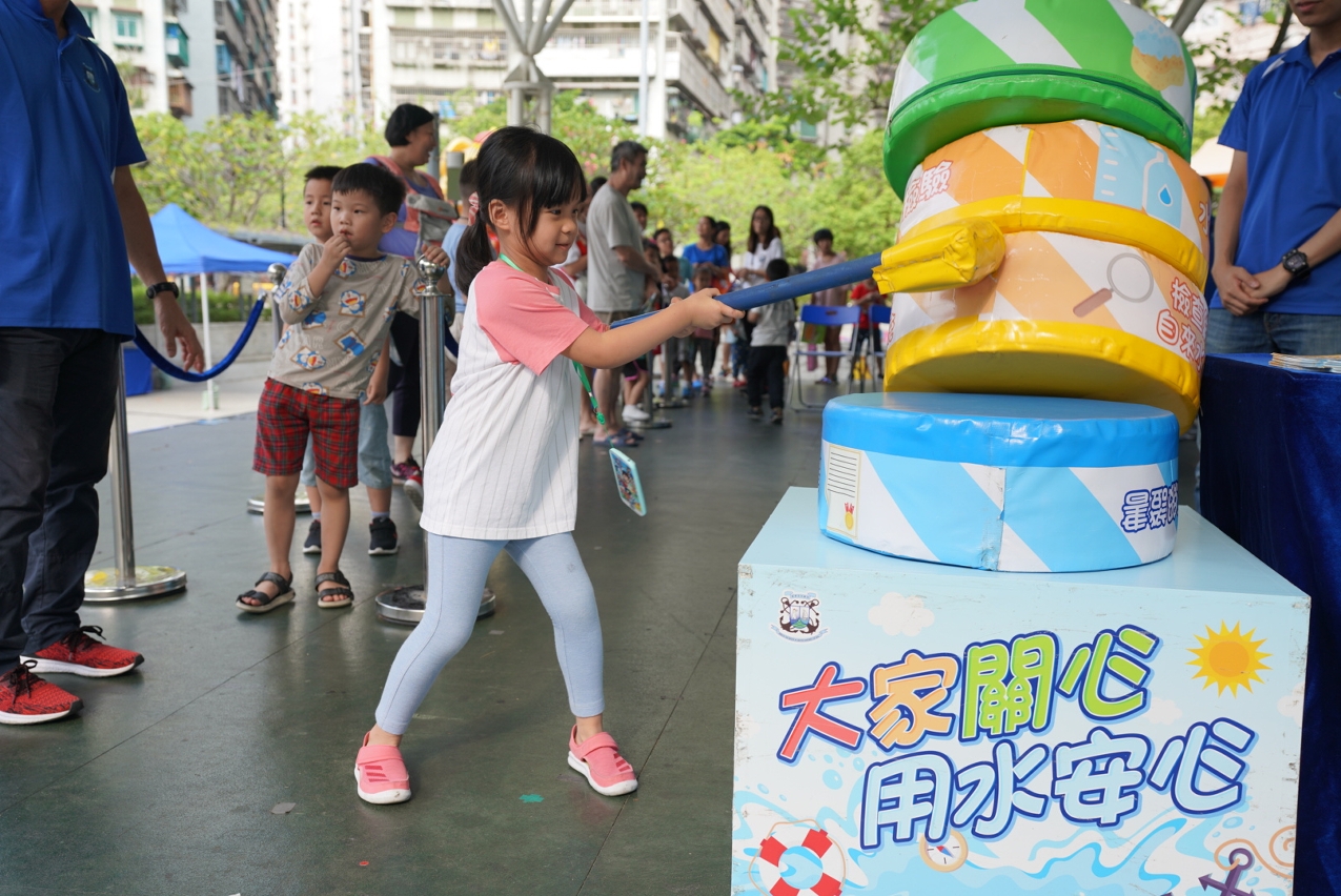 “海安全‧水優質”社區巡禮現場設有多個以航行安全、海事及客運知識、節約用水、認識鹹潮、維護管理樓宇自來水系統等為主題的攤位遊戲,更設有繩結工作坊,由專人教授編織海事繩結,透過有趣互動的方式,讓市民深入淺出地認識澳門水資源和海事狀況,以及保育珍貴水資源和注意海上安全的重要性。小朋友亦可透過穿越“小水滴遊記”的大型充氣關卡,了解澳門的水資源從內地的河道經泵站抽水、輸往水庫儲存、再輸入澳門並經水處理後供應至用戶,可見珍貴的水資源歷經聚多步驟才能到達各家各戶。活動期間亦上演了一場精彩的《威水超人》節水話劇,深受小朋友喜愛的“威水超人”和“水汪汪姐姐” 與市民玩節水遊戲和合照,吸引了眾多小朋友踴躍參與。