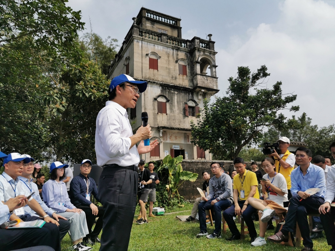 青年參訪團首先參觀了世界文化遺產地——自力村碉樓群,受到江門市及開平市領導的熱情接待,不僅在特色文化展示區欣賞了當地文化工藝,還欣賞了江門青年帶來的音樂演奏與現場寫生作品。其後,譚俊榮司長以“施政回顧•瞻望灣區”為主題,在自力村最具代表性的銘石樓前與青年真情對話,回顧社會文化範疇的施政措施,並探討如何培育青年創新創意與合作思維,提升個人競爭力,積極融入大灣區發展。