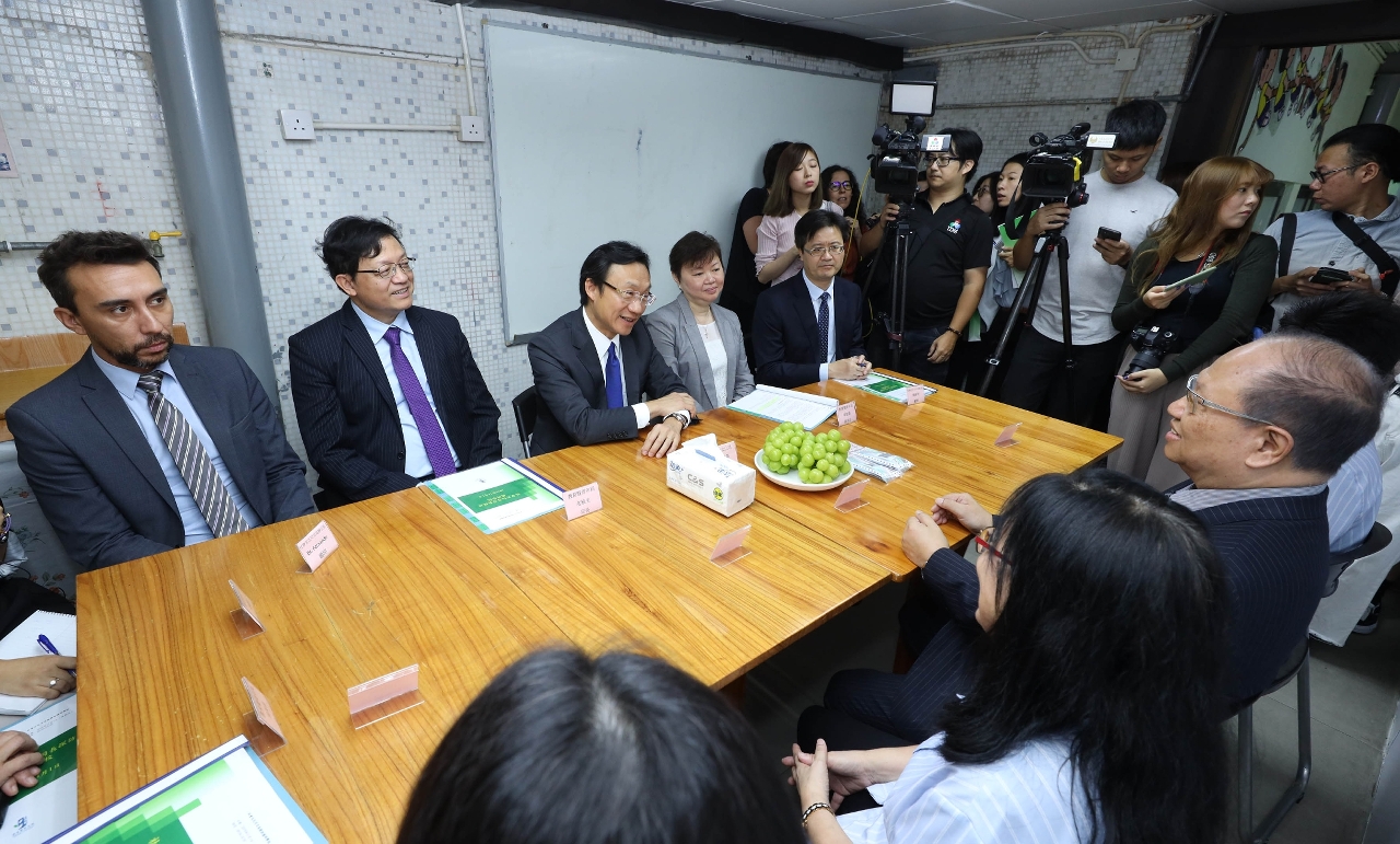 譚俊榮一行早上9時半到訪德明學校,與校長張偉光、主任張笑屏及老師代表座談。譚俊榮指出,澳門特區政府一向重視改善學校的辦學環境,關心學生的健康成長,因此推出“藍天工程”計劃,積極解決裙樓校舍問題。經過與各校的辦學實體及學校代表磋商,尋求共識,本澳的裙樓學校問題已有序得到解決。此外,譚俊榮感謝學校長期以來對本澳教育作出的貢獻,包括積極推展融合教育,幫助有特殊教育需要的學生與同儕和諧共處,一起學習、共同生活,讓學生更好地融入社會。