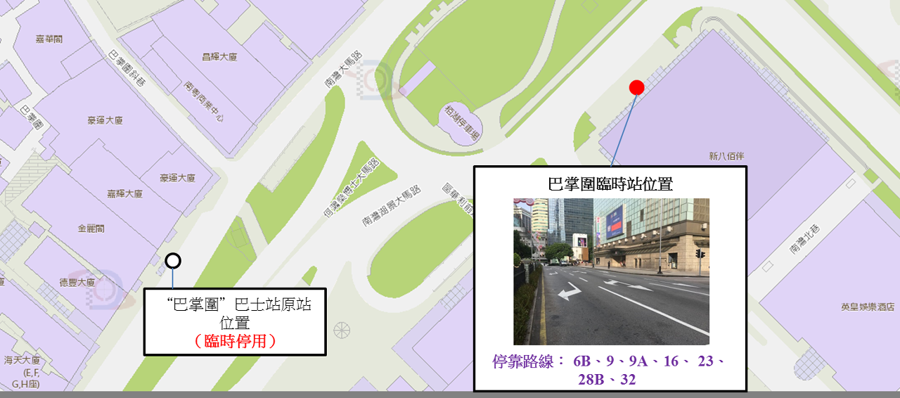 配合市政署及相關公司進行道路整治、電纜及管道鋪設工程,早前公佈政府總部周邊路段實施之臨時交通措施部份將調整實施時間。此外,1月10日(周五)首班車起,“巴掌圍”站臨時停用直至相關路段工程結束,原停靠該站之路線巴士改道行駛,乘客可使用設於南灣湖景大馬路新八佰伴門前的臨時巴士站上落。交通事務局呼籲公眾留意相關安排,詳情請參閱附表。
