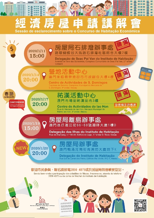 為進一步向市民講解經屋申請的相關情況,包括經屋申請流程及所遞交文件等,房屋局於本月分別在澳門、氹仔及石排灣區,舉辦共六場的經屋申請講解會,現場均設葡語傳譯。