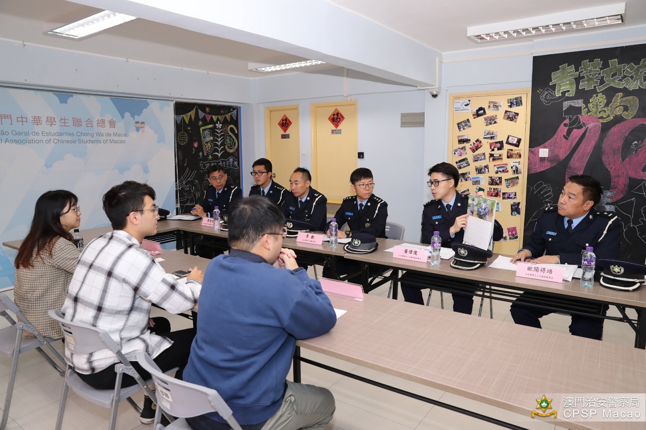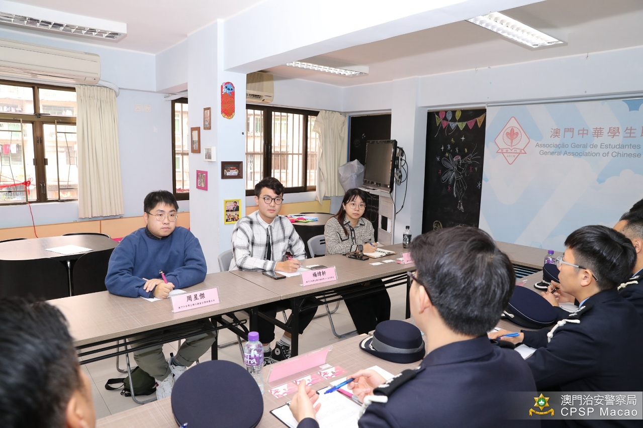 澳門警務廳、交通廳及公共關係處的代表分別介紹了近期罪案和治安情況、交通違例情況、警方在冬防方面的執法和宣傳工作、近年開展的青年活動等,又回顧了雙方過去在培養青少年身心發展方面的多項合作;學聯代表介紹了該會的青年事務整體情況,並表示會將注重交通安全、培養良好的駕駛習慣等訊息傳遞給會員,以及提醒他們在假期參加慶祝活動時應保管好隨身財物和遠離毒品。