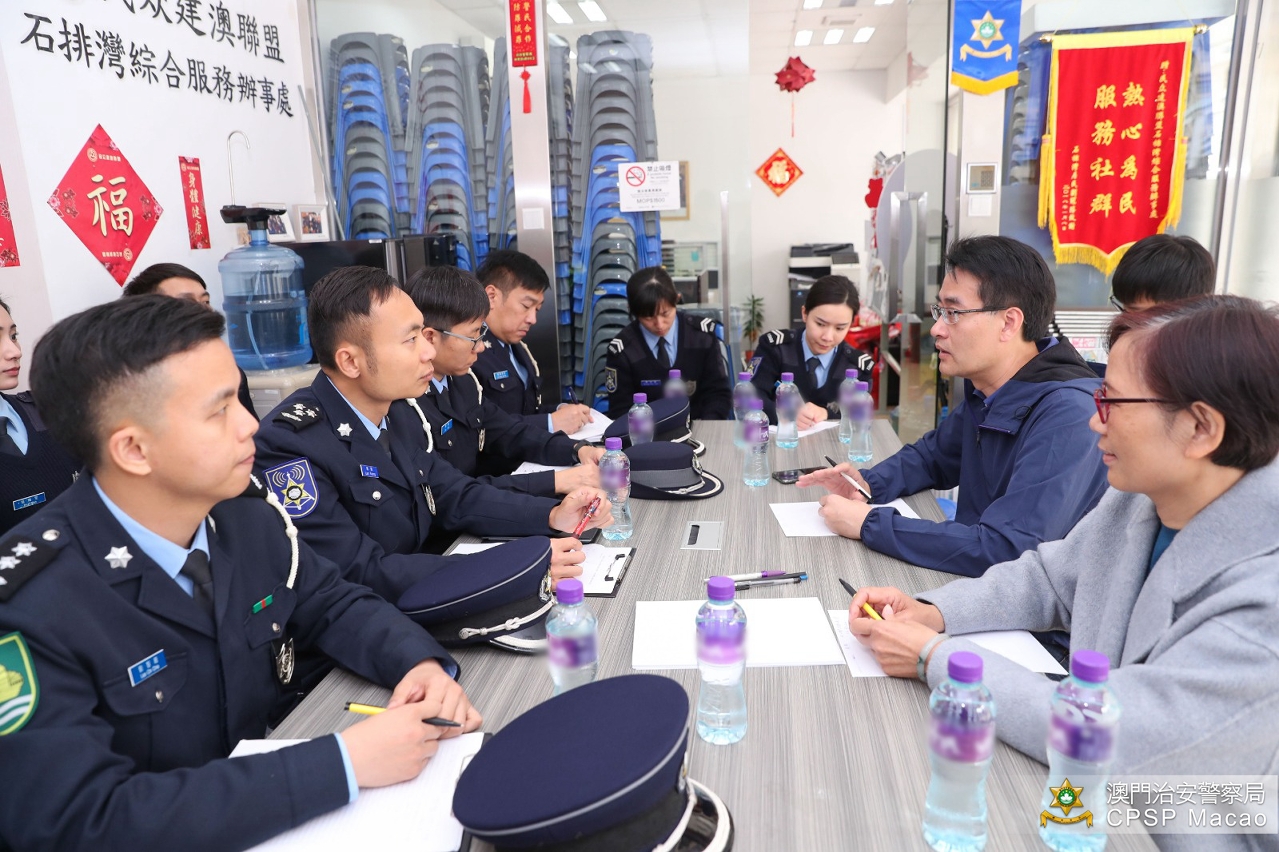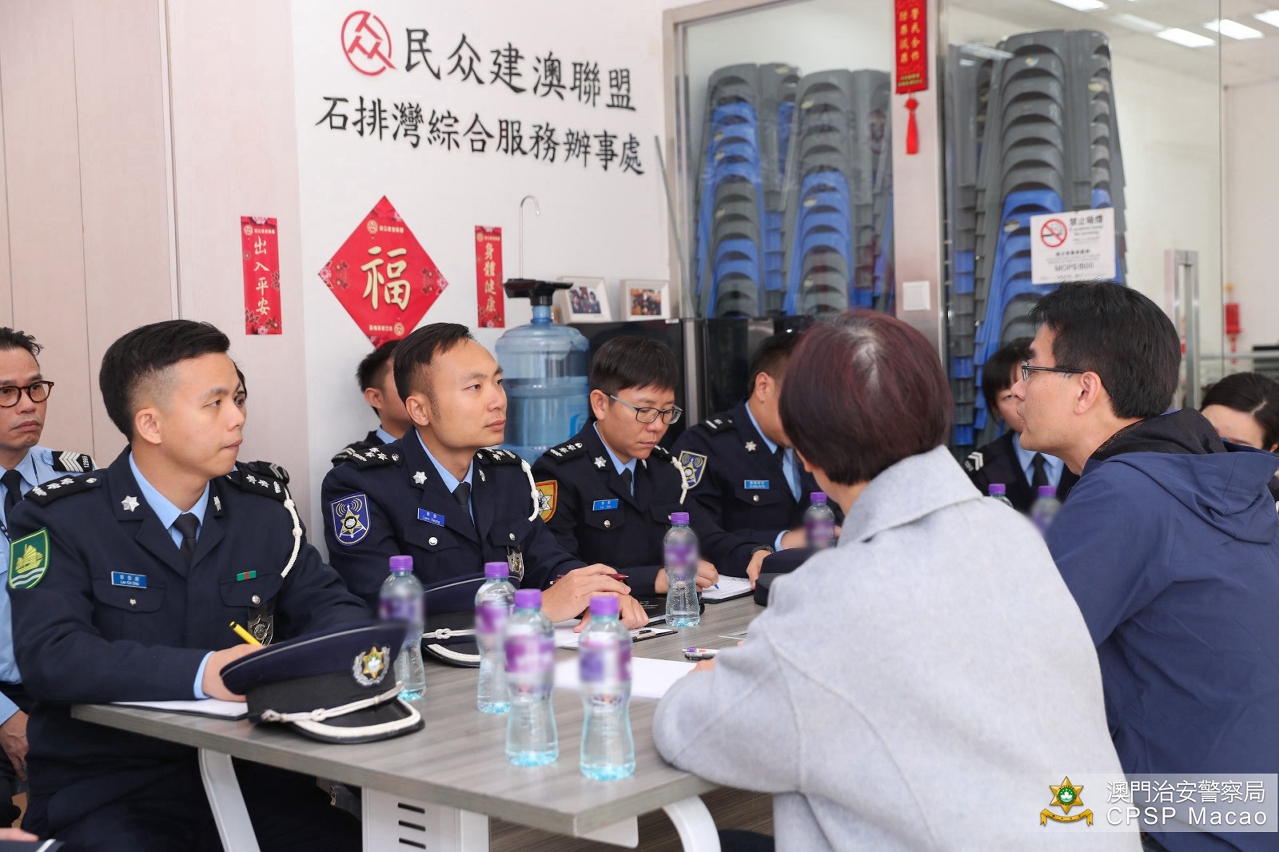 治安警察局於1月13日下午拜訪民眾建澳聯盟,與歐陽廣球及李潔芳副理事長等多位代表進行冬防會議,並一同巡區向市民宣傳防罪資訊。