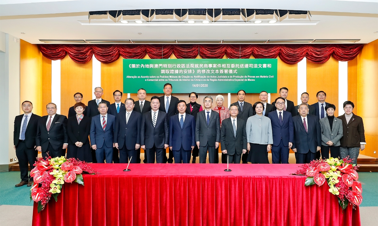 行政法務司司長張永春和最高人民法院副院長楊萬明今(14)日在政府總部簽署《關於內地與澳門特別行政區法院就民商事案件相互委托送達司法文書和調取證據的安排》的修改文本。原《安排》於二零零一年八月十五日簽署。修改文本將於二零二零年三月一日生效。