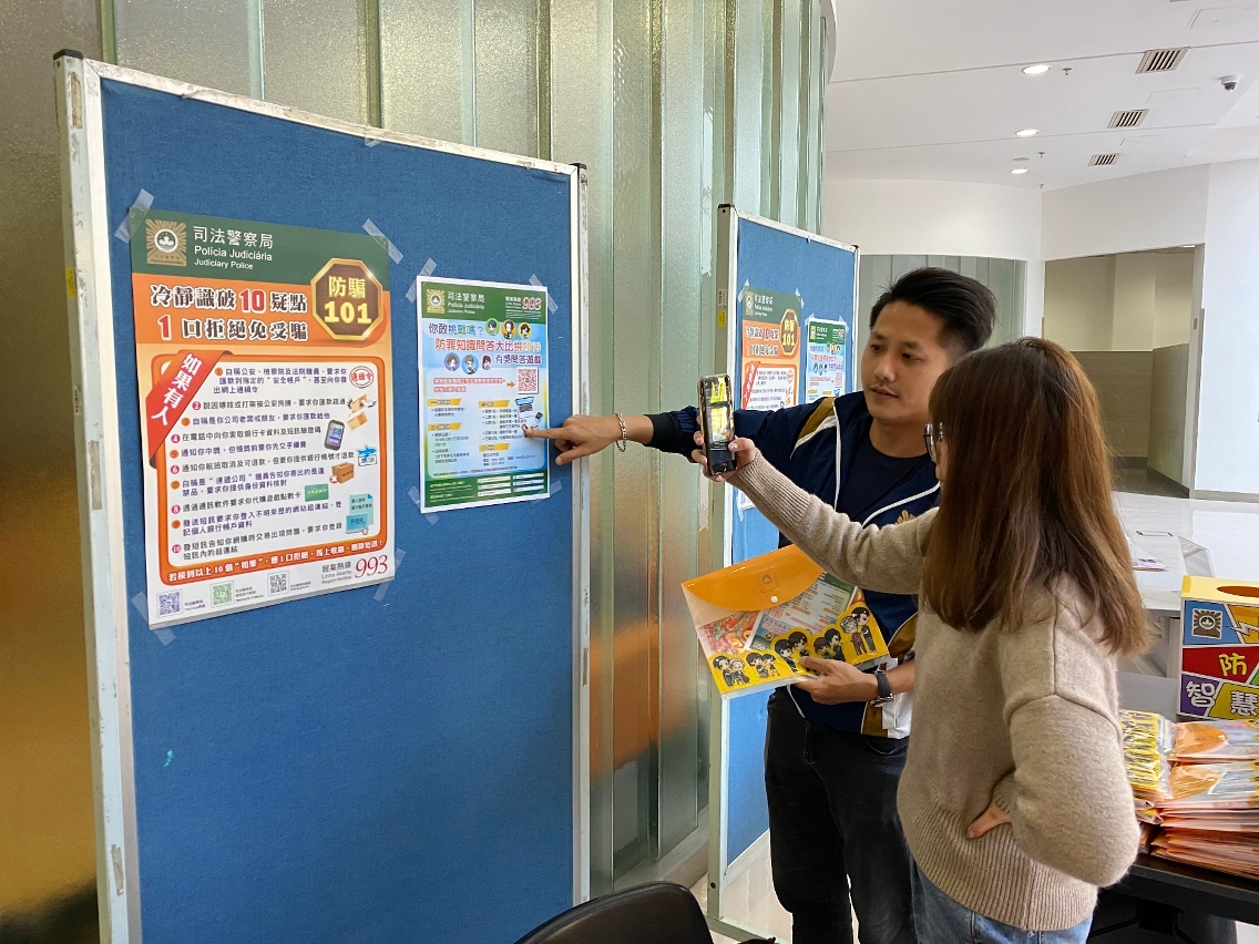 年近歲晚,不法份子往往伺機作案,加上“假冒政府機關人員”的詐騙電話持續出現,為更廣泛有效地傳播防騙資訊,加強年輕人特別是大專學生的防騙警覺性,司法警察局再次派員走進本澳大專院校設置防騙宣傳攤位,讓學生知悉最新的電話詐騙手法,免墮騙局。