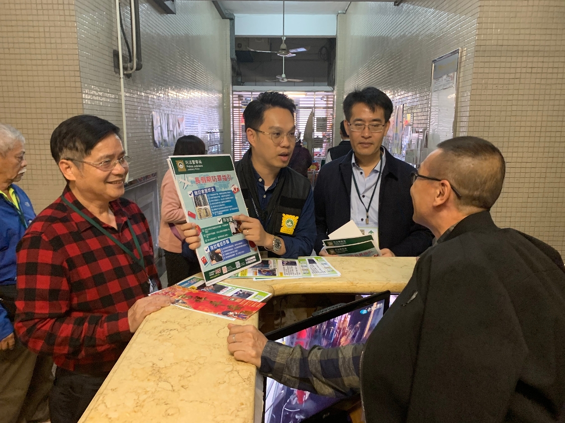 此外,司警局人員還先後聯同上述社團代表及“司警局大廈防罪之友"會員巡查社區治安黑點,以及到各區的住宅和工業大廈、休憩區、巴士站及商舖進行冬防宣傳,向居民、商戶和物業管理人員講解冬防資訊並瞭解區內的治安情況。司警局人員特別提醒居民在節假日期間須做好家居防盜措施,前往人多擠迫地方時應注意安全,保管好個人財物;呼籲大廈管理人員加強大廈保安工作,如發現或懷疑犯罪,應馬上向警方舉報。