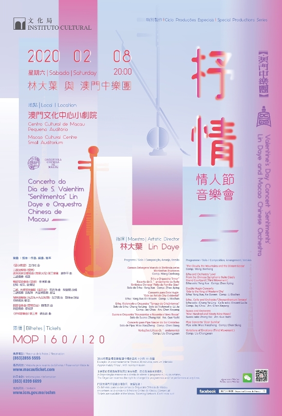 《抒情》情人節音樂會讓觀眾感受中樂心動之美,歡迎各位愛樂人士親臨觀賞,音樂會完場後將設有簽名會。門票現正於澳門售票網發售,價格分為160及120澳門元,設多項購票優惠。詳情可致電8399 6679或瀏覽www.icm.gov.mo/ochm。