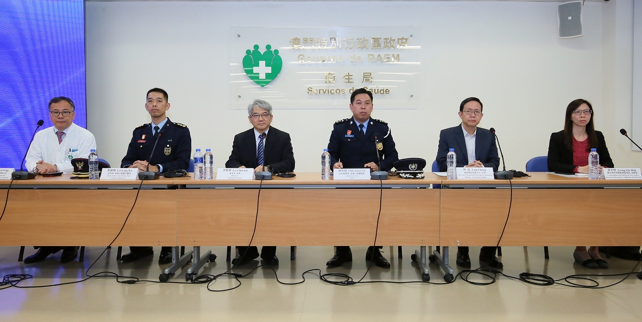新型冠狀病毒感染應變協調中心今(25)日舉行記者會發佈新型冠狀病毒最新情況及本澳各項防控措施,出席人員包括衛生局李展潤局長、治安警察局策劃行動廳趙崇遠廳長、消防局海島行動廳李龍傑代廳長、仁伯爵綜合醫院李偉成醫務主任、疾病預防控制中心林松主任、傳染病防制暨疾病監測部梁亦好協調員。