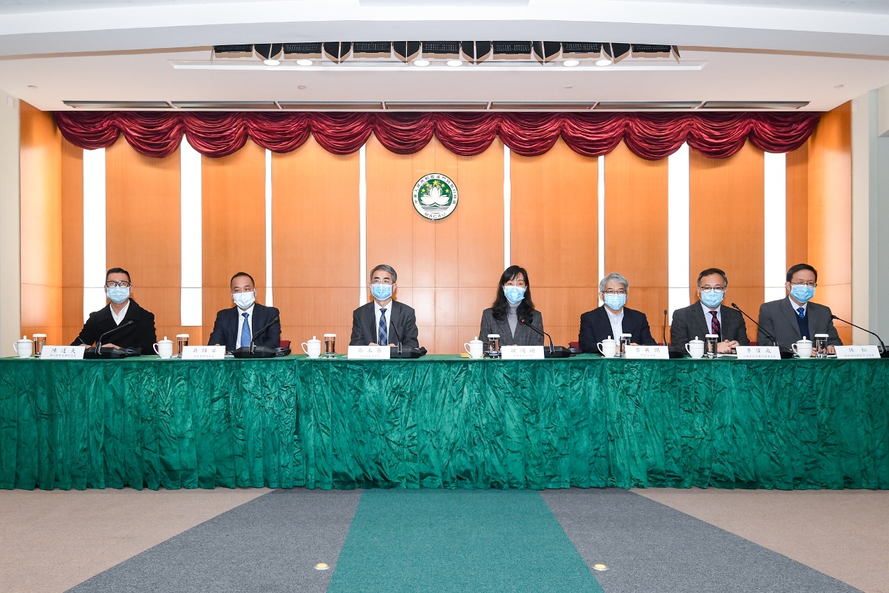 新型冠狀病毒感染應變協調中心今(26)日舉行記者會發佈新型冠狀病毒最新情況及本澳各項防控措施,出席人員包括社會文化司歐陽瑜司長、行政法務司張永春司長、衛生局李展潤局長、治安警察局吳錦華局長、博彩監察協調局陳達夫局長、仁伯爵綜合醫院李偉成醫務主任、疾病預防控制中心林松主任。