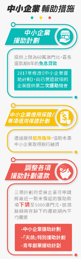 “中小企業援助計劃”為澳門中小企業提供一筆上限為60萬澳門元的免息援助貸款,最長還款期為8年,符合資格的中小企業可因受疫症事件影響而導致經濟及財政出現困難而提出申請。