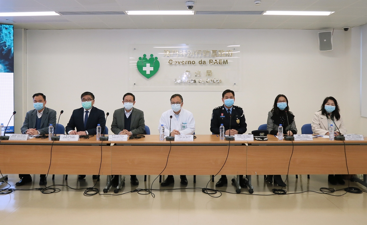 新型冠狀病毒感染應變協調中心(下稱應變協調中心)於今(1)日舉行「新型冠狀病毒最新情況及本澳各項防控措施」記者發佈會,仁伯爵綜合醫院李偉成醫務主任、疾病預防控制中心林松主任、治安警察局行動策劃廳趙崇遠廳長、教育暨青年局教育廳江毅廳長、旅遊局執照及監察廳陳露廳長、社工局家庭及社區服務廳李麗萍廳長、高等教育局高等院校學生廳陳旭偉廳長共同會見傳媒。