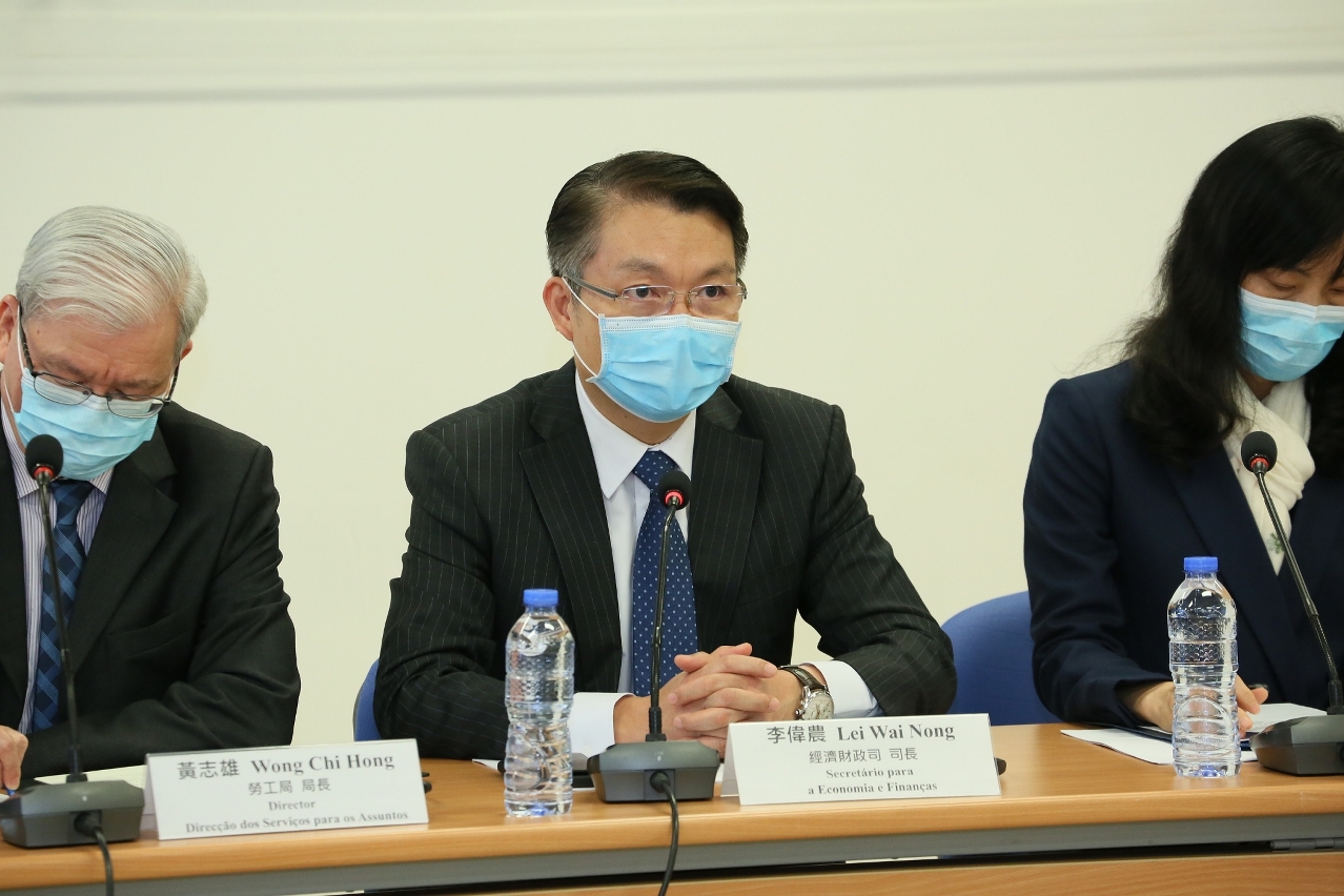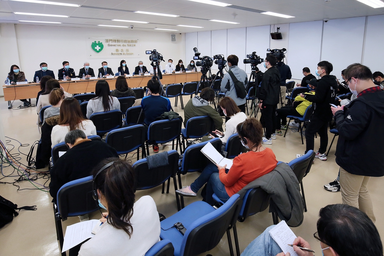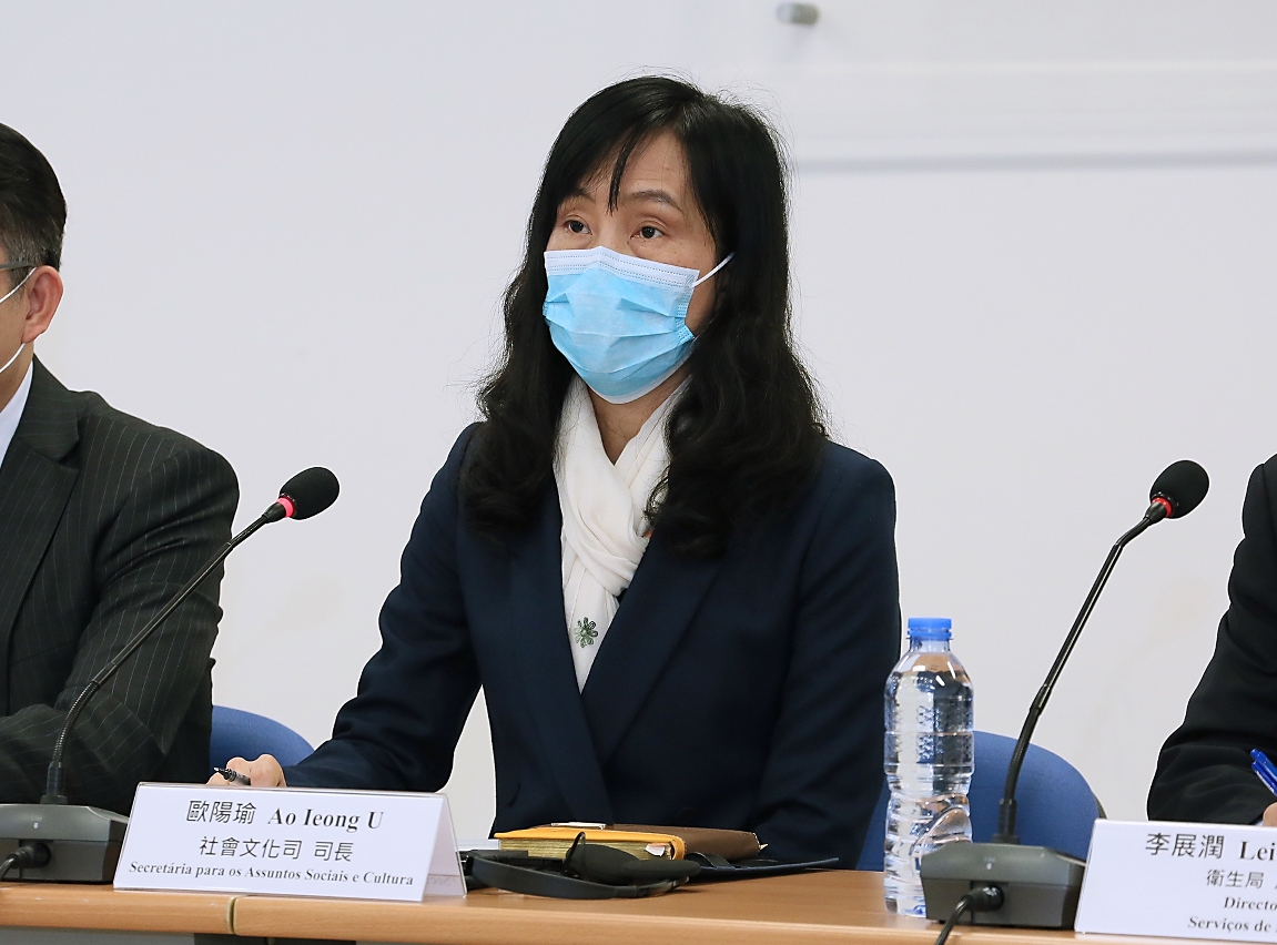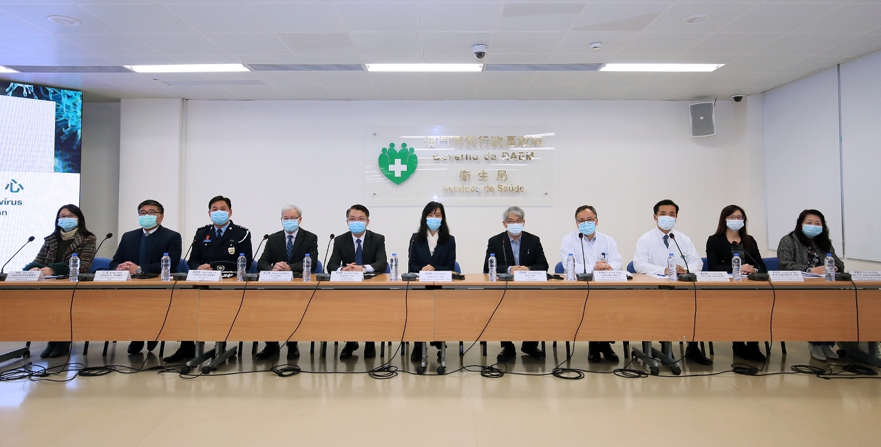 新型冠狀病毒感染應變協調中心(下稱應變協調中心)於今(2)日舉行「新型冠狀病毒最新情況及本澳各項防控措施」記者發佈會,社會文化司歐陽瑜司長、經濟財政司李偉農司長、衛生局李展潤局長、勞工局黃志雄局長、仁伯爵綜合醫院李偉成醫務主任、羅奕龍醫務主任、疾病預防控制中心梁亦好協調員、治安警察局行動策劃廳趙崇遠廳長、教育暨青年局教育廳江毅廳長、旅遊局執照及監察廳陳露廳長、社會工作局家庭及社區服務廳李麗萍廳長共同會見傳媒。