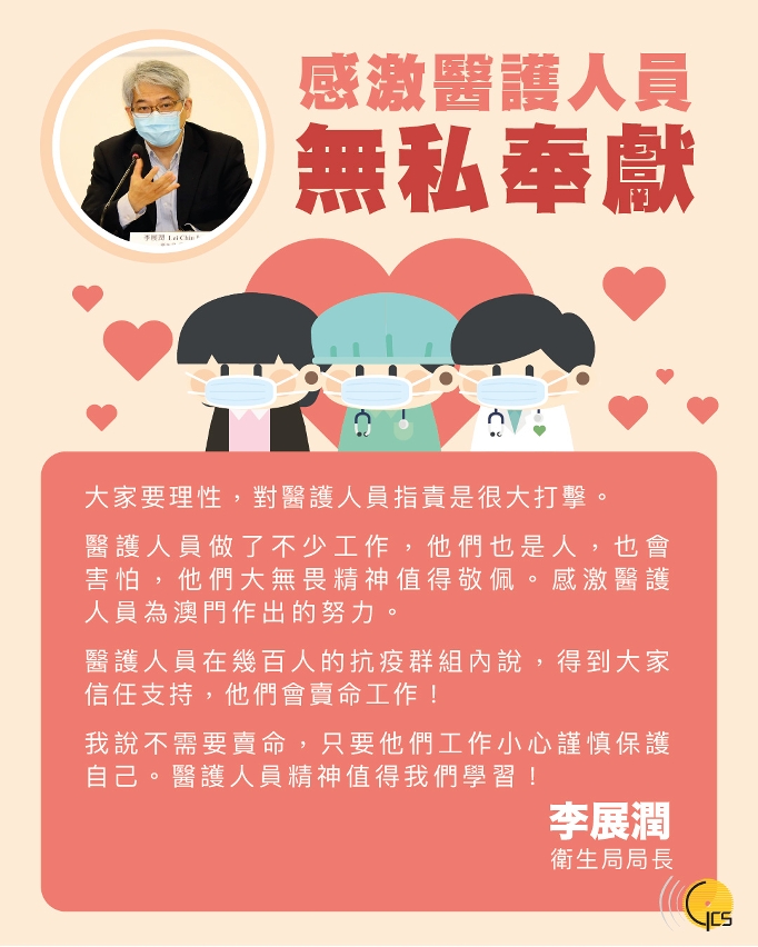衛生局李局長今(2)日在新型冠狀病毒感染應變協調中心記者會上的一番話,值得你我回顧和深思,亦提醒大家要衷心感謝為我們無私奉獻的醫護人員,一齊為他們加油💪!