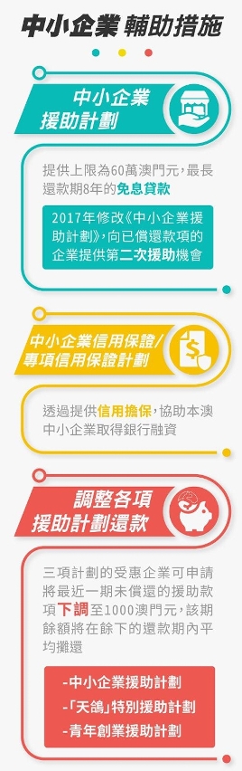 對於受影響的中小企,經濟局亦加快審批援助計劃、信用保證計劃以及專項信用保證計劃等,同時調整還款措施,以解燃眉之急。為發揮牽頭作用,決定由2月份開始,對已出租作購物中心及售賣亭等商業活動的政府物業,免收承租人的租金,為期3個月。