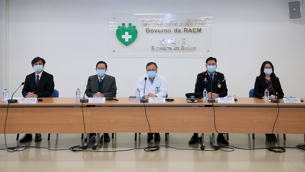 新型冠狀病毒感染應變協調中心(下稱應變協調中心)於今(5)日舉行「新型冠狀病毒最新情況及本澳各項防控措施」記者發佈會,仁伯爵綜合醫院李偉成醫務主任、疾病預防控制中心林松主任、治安警察局策劃行動廳趙崇遠廳長、教育暨青年局教育研究暨資源廳黃健武廳長、旅遊局執照及監察廳陳露廳長共同會見傳媒。