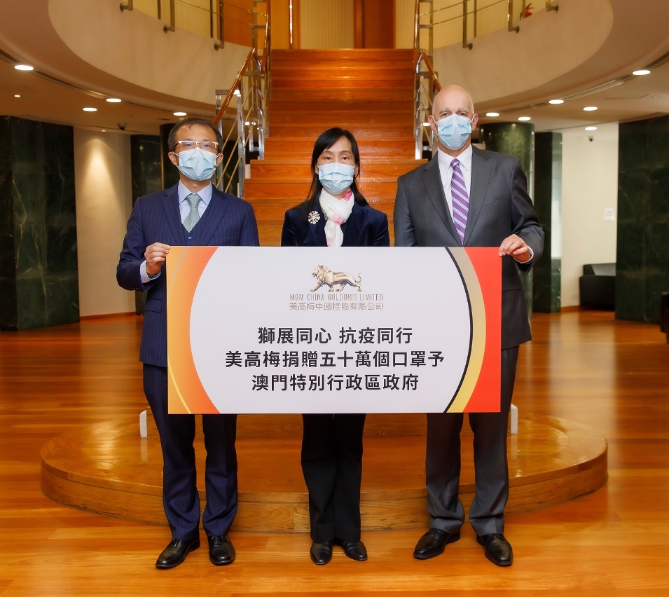 美高梅中國控股有限公司今(19)日向特區政府捐贈50萬個口罩,由社會文化司司長歐陽瑜代表特區政府接收。