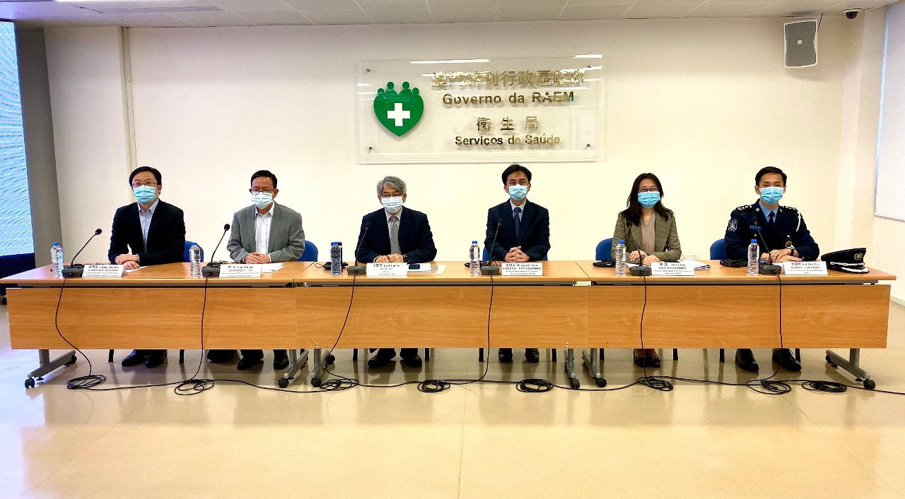 新型冠狀病毒感染應變協調中心(下稱應變協調中心)於今(29)日舉行例行記者會,衛生局李展潤局長、教育暨青年局教育研究暨資源廳黄健武廳長、旅遊局執照及監察廳陳露廳長、疾病預防控制中心林松主任、治安警察局公共關係處李德輝處長、仁伯爵綜合醫院急診部曾潭飛協調員共同會見傳媒。