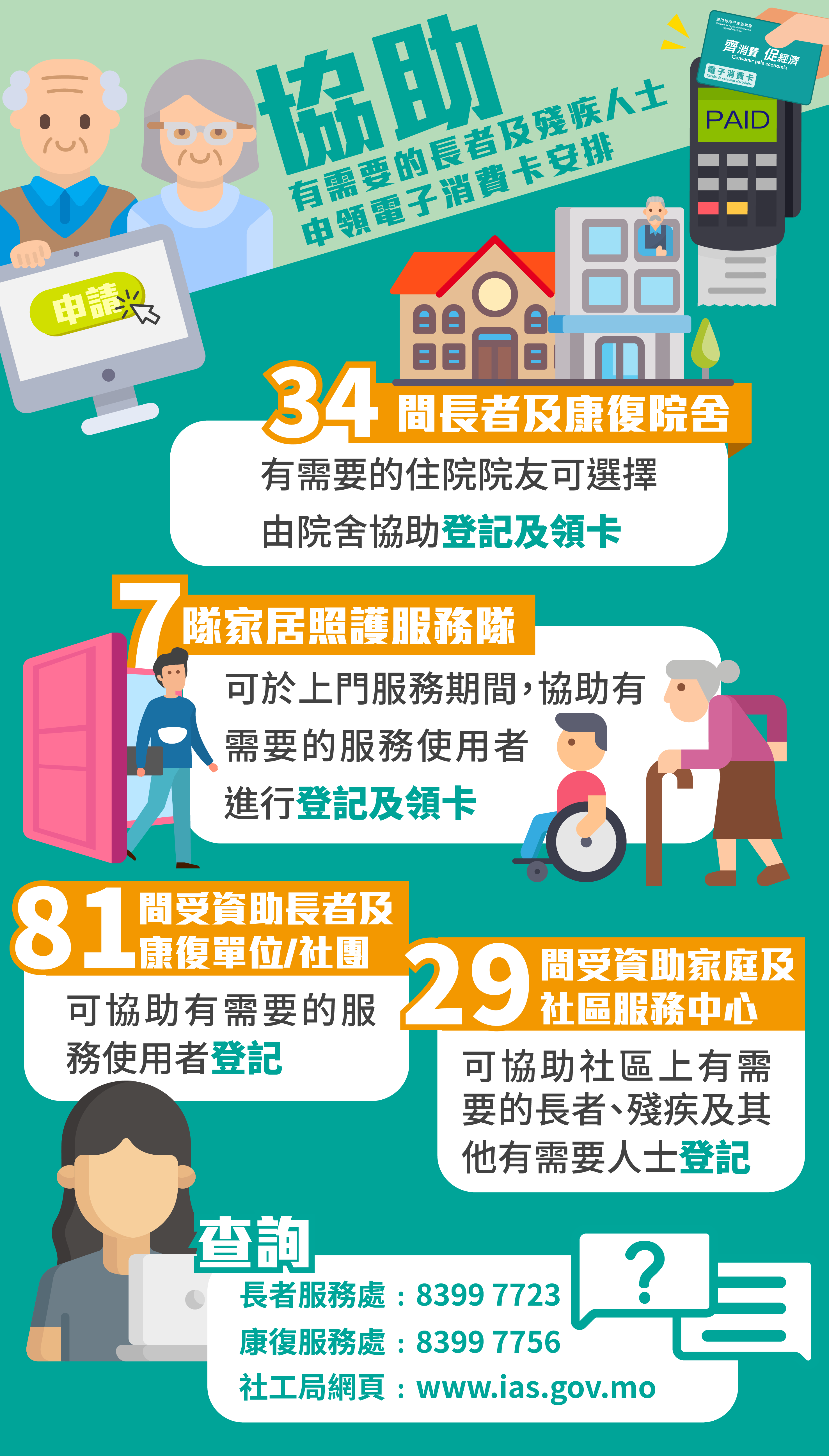 對於部分長者及殘疾人士,社會工作局亦提供適切支援,主動協助有需要的人士,辦理登記手續。