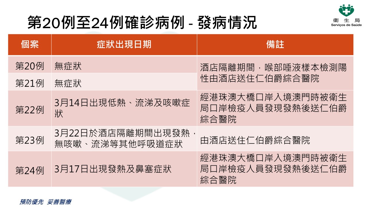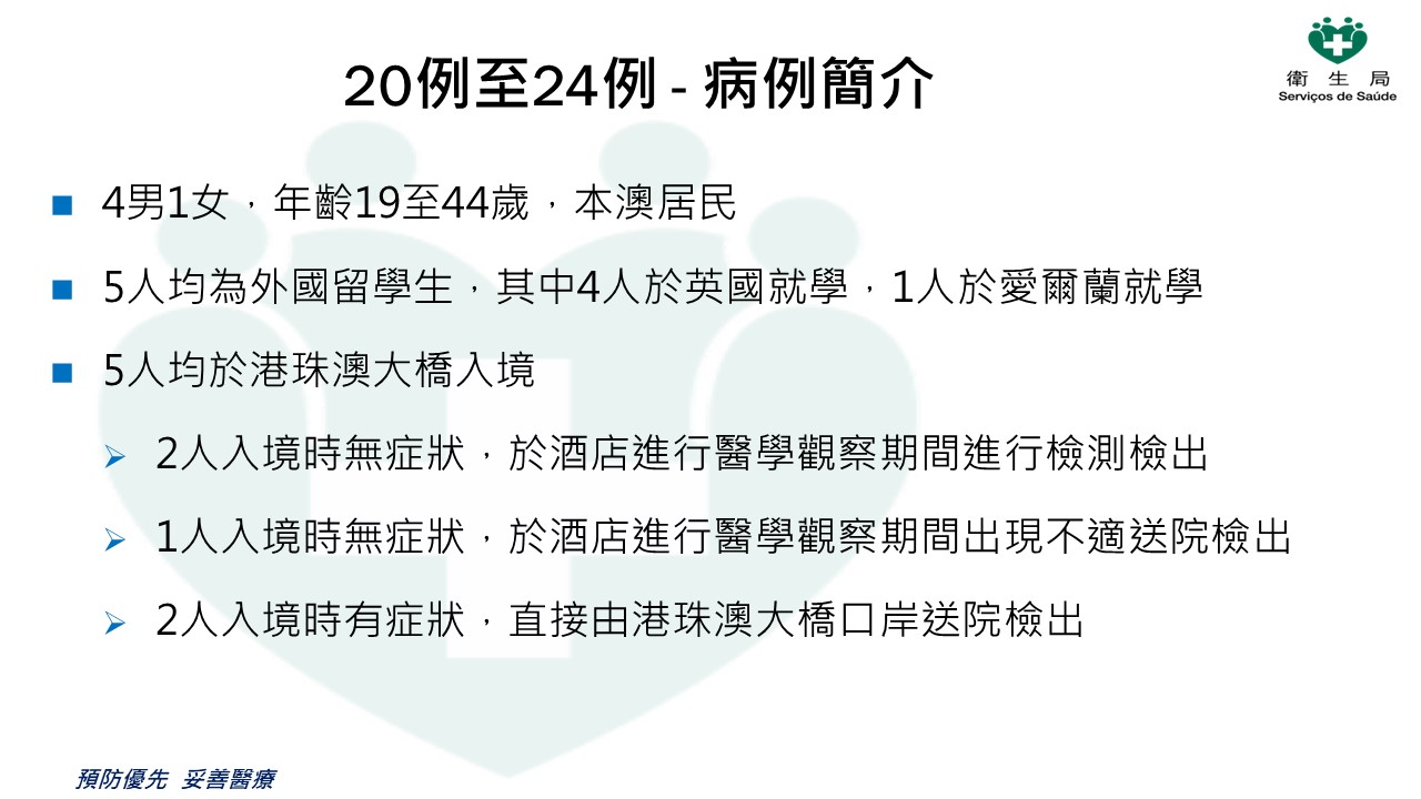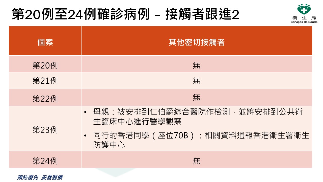 新型冠狀病毒感染應變協調中心今(23)日表示,過去24小時本澳新增5例新型冠狀病毒肺炎確診病例,累計24例確診病例。