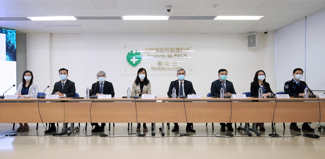 新型冠狀病毒感染應變協調中心(下稱應變協調中心)於今(27)日舉行例行記者會,社會文化司歐陽瑜司長、保安司黃少澤司長、衛生局李展潤局長、仁伯爵綜合醫院羅奕龍醫務主任、教育暨青年局教育廳黃嘉祺廳長、旅遊局執照及監察廳陳露廳長、治安警察局公共關係處李德輝處長、疾病預防控制中心傳染病協調員梁亦好醫生共同會見傳媒。