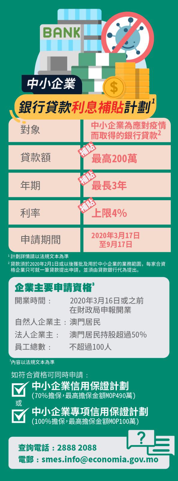 新冠肺炎疫情下,特區政府針對本澳中小企出台兩項臨時的措施安排,“中小企業援助計劃”和“中小企業銀行貸款利息補貼計劃”。臨時性的援助計劃推出後,截至3月26日共收到3423宗申請,已通過評審個案1700宗,陸續支付5.90億澳門元援助資金。另外,臨時性的利息補貼計劃自3月17日開始接受申請,截至3月26日收件734宗。