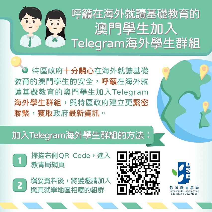 應變協調中心表示,特區政府十分關心在海外就讀基礎教育的澳門學生的安全,為適時發佈政府最新防疫、抗疫等資訊,教育暨青年局與高等教育局合作,將現有Telegram海外學生群組擴大,呼籲在海外就讀 “基礎教育” 的澳門學生及其家長登入專頁 (https://s.dsej.gov.mo/qa/Q0000109/ ) 填妥個人資料和在學資料,學生和家長將獲邀請加入與其就學地區相應的群組。