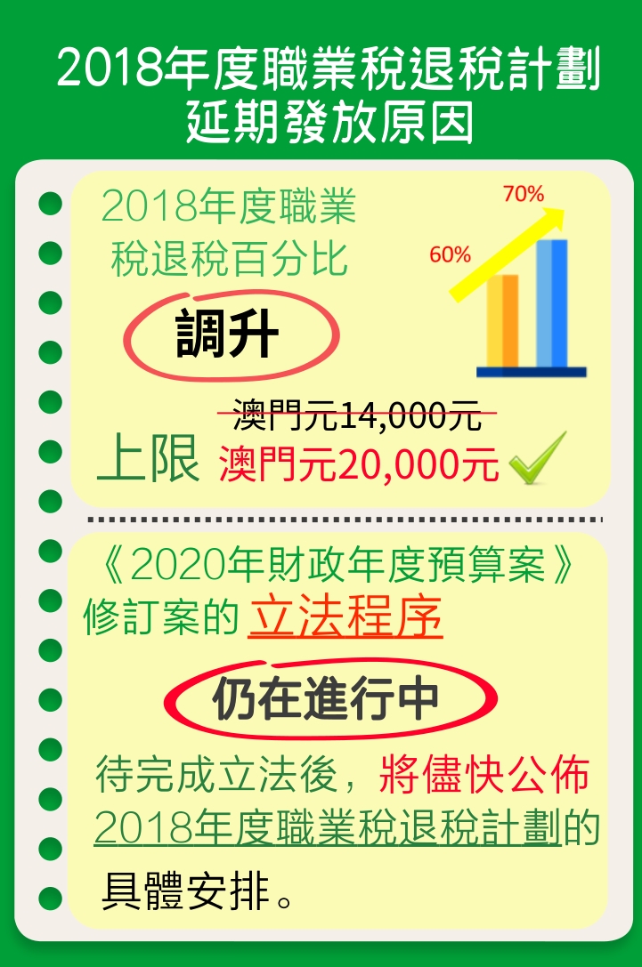因應新型冠狀病毒肺炎的影響,特區政府推行多項紓解民困措施,其中包括調升退還2018年度職業稅稅款的百分比及上限,百分比由原來60%調升至70%,上限則由原來14,000元調升至20,000元;由於《2020年財政年度預算案》修訂案的立法程序仍在進行中,待完成立法後,財政局將儘快公佈2018年度職業稅退稅計劃的具體安排。