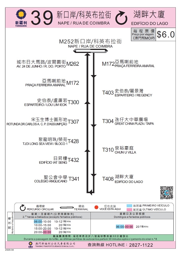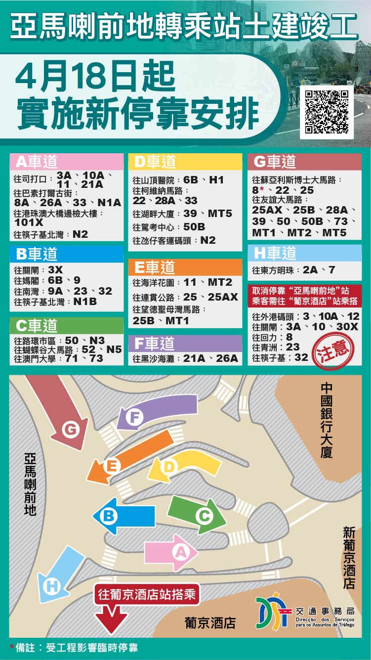 亞馬喇前地轉乘站首期土建工程竣工,交通事務局由4月18日(周六)日間路線首班車起,重新分配站內各月台之巴士路線停靠站位;同時部份原停靠“亞馬喇前地”站及“葡京酒店”站之路線亦會調整為只停靠其中一個站點,詳情請參閱附表。此外,同日起,39路線延伸服務範圍至皇朝,並調整總站至“新口岸/科英布拉街”站。