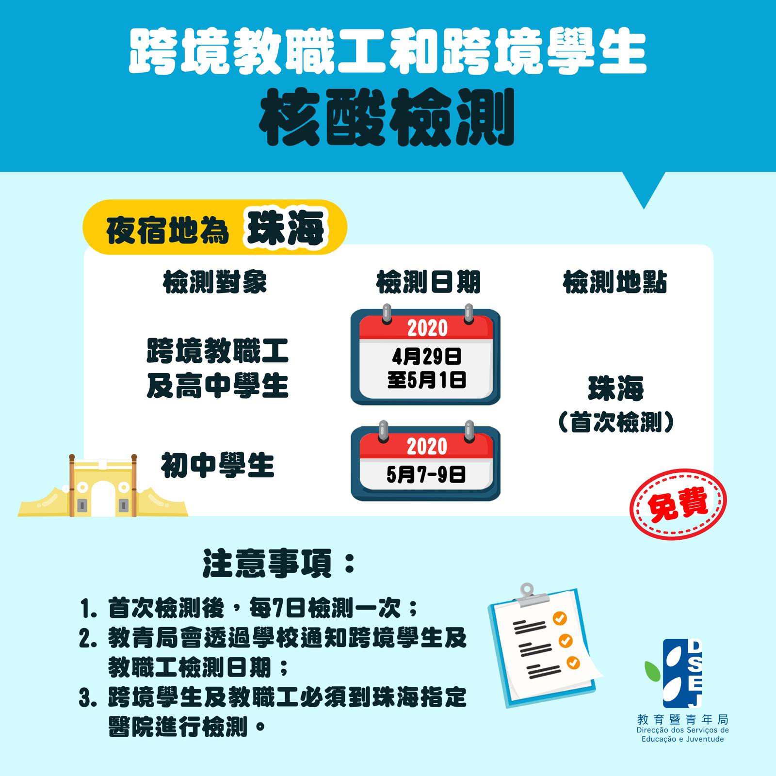 所有跨境教職工和學生,每七天須進行一次檢測,可順利往返珠澳。而相關檢測工作,教青局聯同衛生局,與內地相關部門已緊密協調,在珠海指定醫院進行檢測,並將透過學校通知須進行檢測的教職工和跨境學生有關日期、時間、地點等詳細內容和安排。