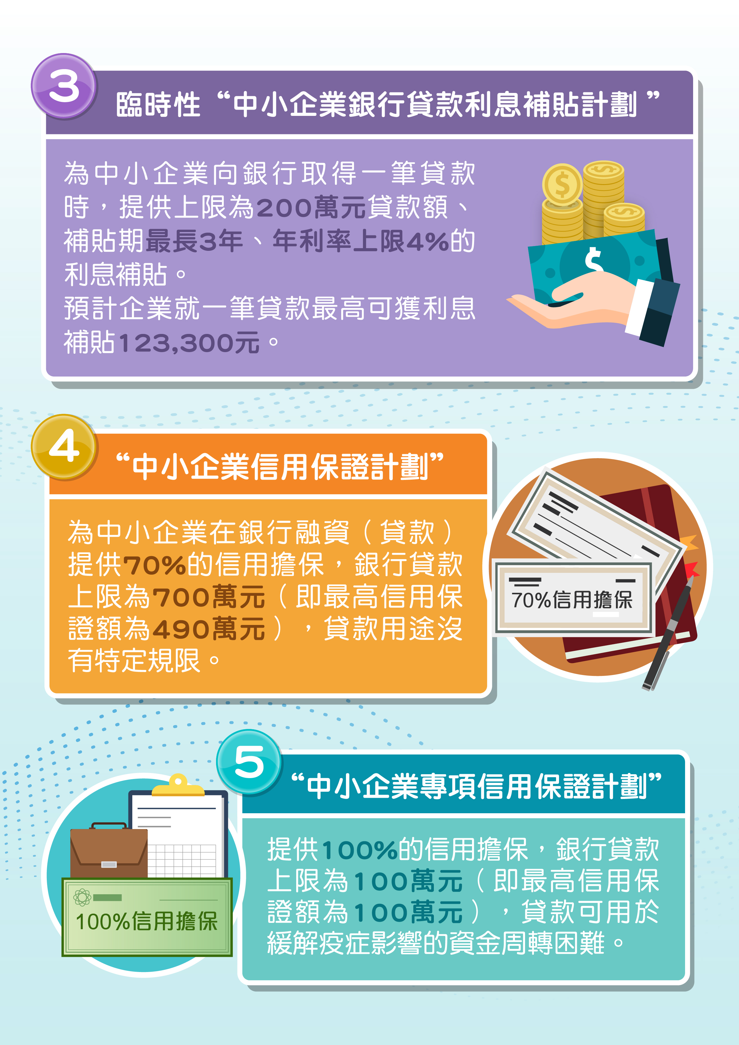 配合“利息補貼計劃”,有需要的中小企亦可同時申請“中小企業信用保證計劃”或“中小企業專項信用保證計劃”,由特區政府為申請企業向銀行提供信用保證,以協助企業向銀行取得貸款。