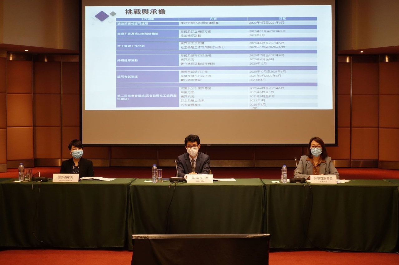 會上匯報了《社會工作者專業資格制度》的相關工作。韓衛介紹了《社會工作者專業資格制度》的發展歷程、宣傳及普法工作、構建專業資格認可及註冊一站式網上申請系統等。社會工作者專業委員會主席區志強則介紹了社專會的一系列工作,包括制定《專業資格認可準則》及《社會工作者倫理工作守則》,上述內容已刊登於澳門特別行政區公報;匯報專業資格認可情況以及面對的挑戰等。自法律於今年4月2日生效起至4月20日期間,共759人提交了專業資格認可申請,當中通過專業資格認可有355人。在通過社專會負責的專業資格認可程序後,可進入社工局負責的執業註冊審批程序。