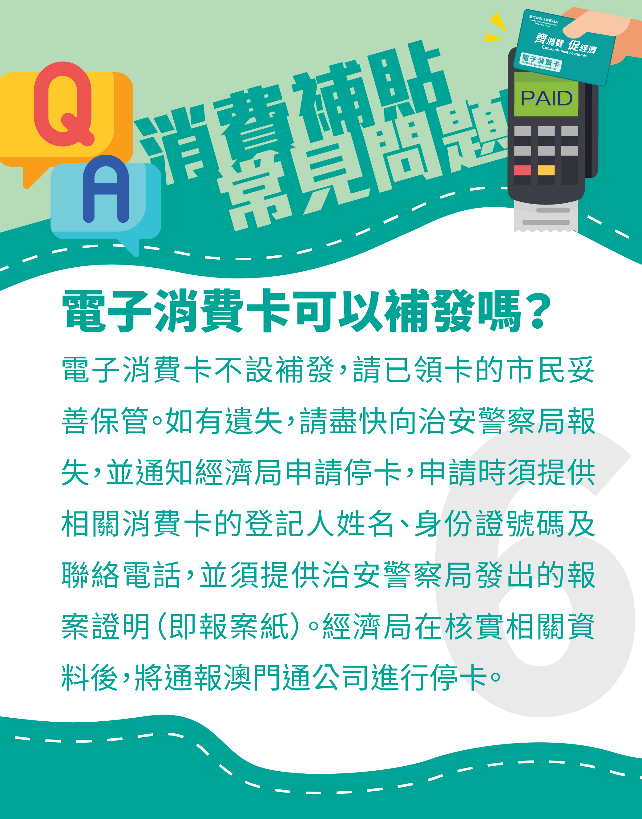 電子消費卡不設補發,請已領卡的市民妥善保管。如有遺失,請盡快向治安警察局報失,並通知經濟局申請停卡,申請時須提供相關消費卡的登記人姓名、身份證號碼及聯絡電話,並須提供治安警察局發出的報案證明(即報案紙)。經濟局在核實相關資料後,將通報澳門通公司進行停卡。