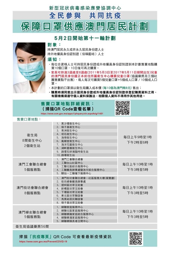 新型冠狀病毒感染應變協調中心今日公佈,第11輪保障口罩供應澳門居民計劃於明(2)日開始,特區政府保證口罩供應充足,無須急於首一兩天排隊輪候。第11輪計劃的實施方式、售賣點及售賣時間等與第10輪相同,對象為本澳永久及非永久居民、持外地僱員身份認別證(俗稱藍咭)人士;衛生局轄下衛生中心及衛生站、衛生局協議藥房、本澳三個社團(工聯、街總、婦聯)繼續提供售賣口罩服務,即全澳共有84個售賣點。所有合資格人士憑澳門居民身分證或藍咭正本,每人每次可購買10個口罩。兒童口罩方面,繼續供應滿3週歲至8週歲(2011年5月3日至2017年5月11日期間出生)的兒童,每人每次可購買5個兒童口罩;基於公平原則,此年齡組別的兒童可購買5個兒童口罩和5個成人口罩,也可選擇購買10個成人口罩。