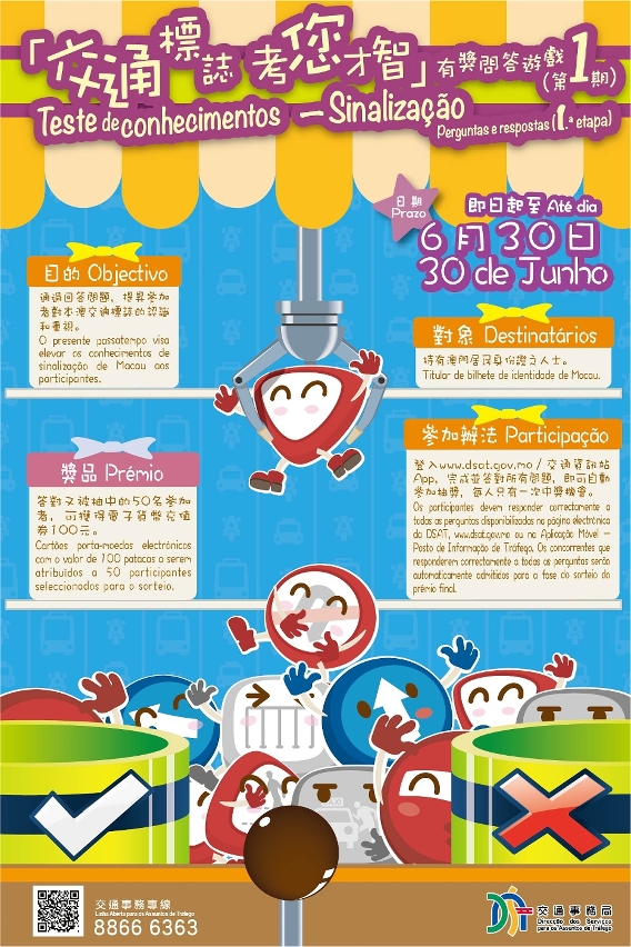 交通事務局推出第一期“交通標誌 考您才智"有獎問答遊戲,即日起至6月30日(周二),市民可登入交通事務局網頁www.dsat.gov.mo或手機應用程式“交通資訊站”App填寫答案及進行報名,答對又被抽中的50名參加者,可獲得電子貨幣充值券100元。