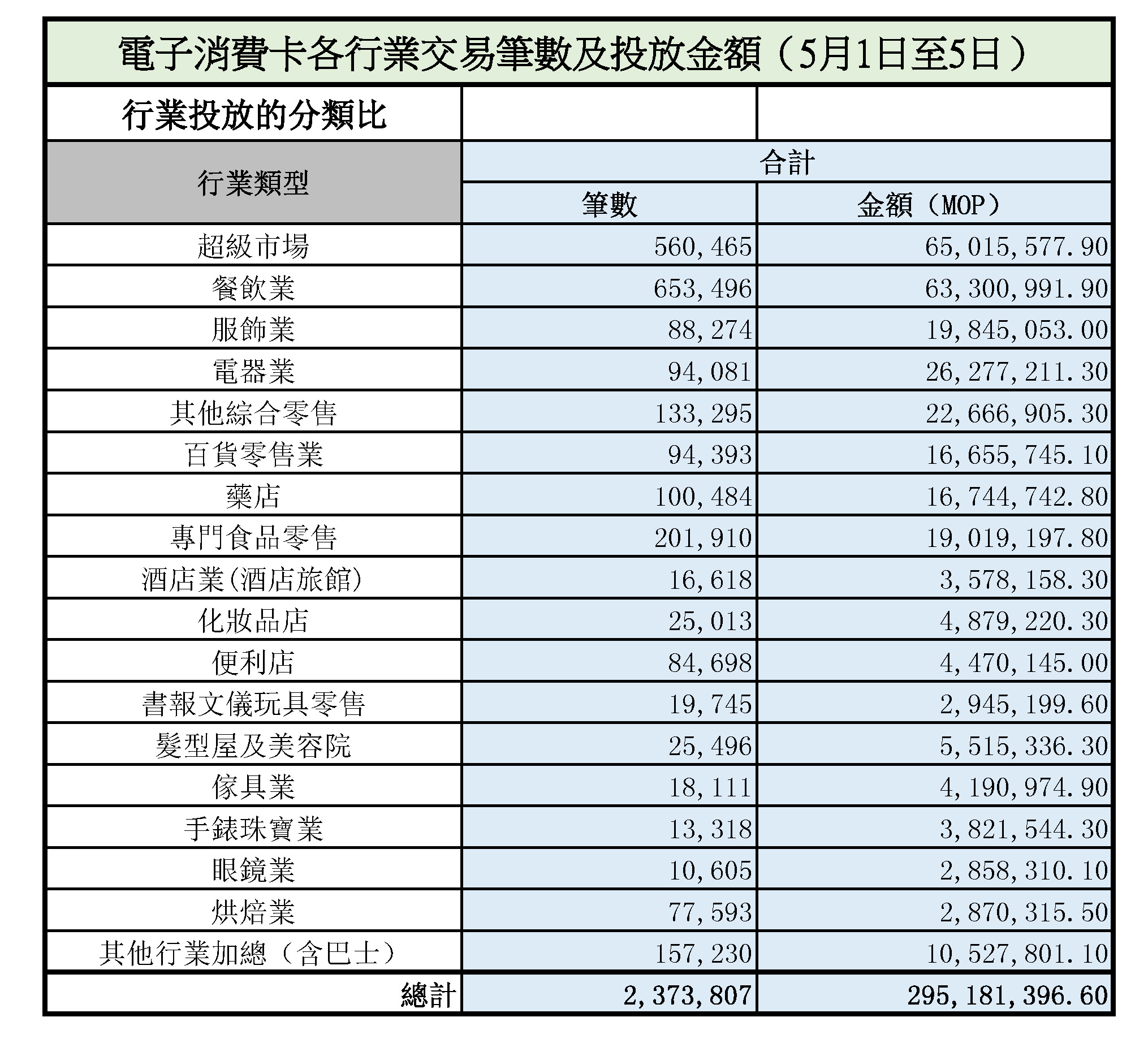 電子消費卡自5月1日開始使用以來,首5天已有237萬筆交易,合共向市場注入2.95億澳門元。按照初步統計,不同行業均有受惠,在受疫情影響經濟急速下滑之際,為本地各行各業注入強心針。