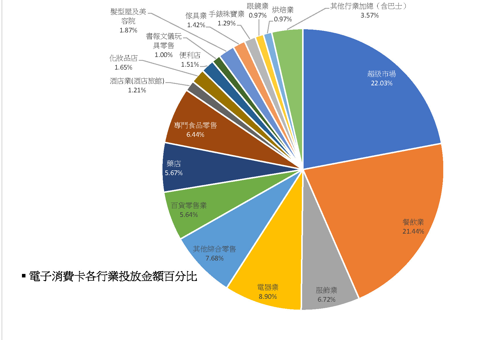 按交易筆數計算,頭五位的行業包括飲食業、超市業、專門食品業、中小型百貨零售業、藥店,分別是27.53%、23.61%、8.51%、5.62%、4.23%。按交易金額計算,交易頭五位的行業包括超市業、飲食業、電器業、中小型百貨零售業、服飾業,佔比分別是22.03%、21.44%、8.90%、7.68%、6.72%。
