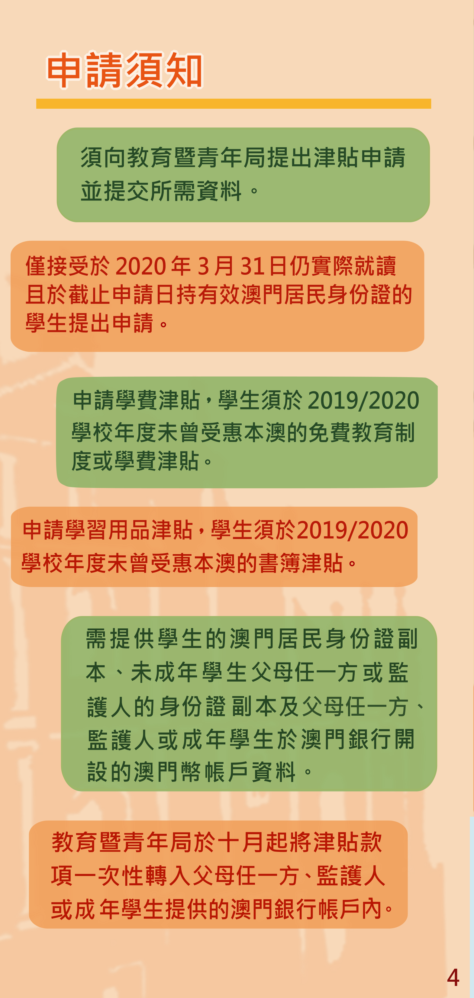 法規規定凡就讀高中教育的有關學生,須於二零二零年六月至八月期間,參與由教育暨青年局組織的、旨在加強對澳門政治、經濟及文化等方面認識的課程,其課時不少於十二小時且學生出席率不得低於百分之八十,方可獲發放津貼。