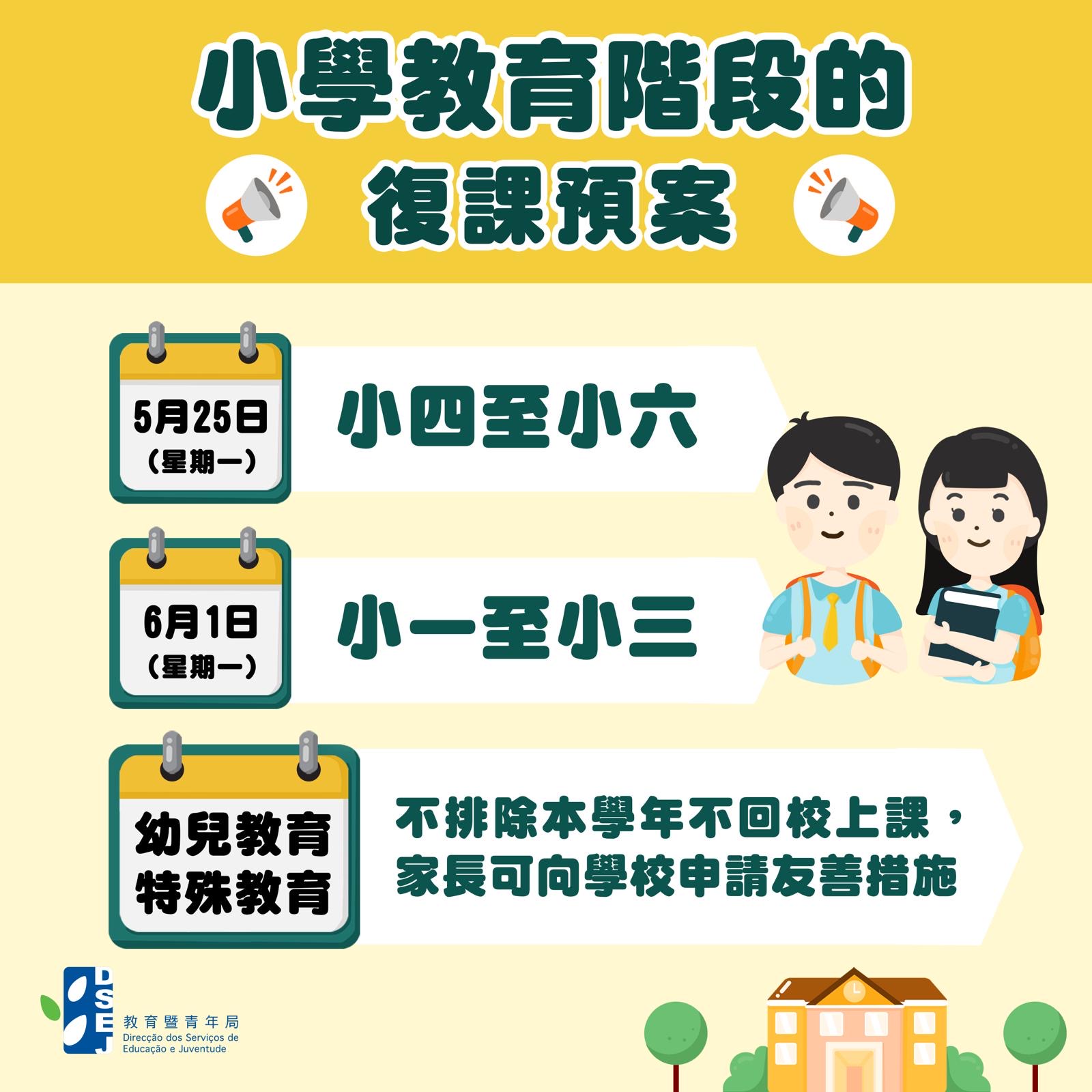 在諮詢衛生部門,並聽取其專業意見,以及與教育界代表進行深入和實務的探討後,教育暨青年局擬定了小學教育的復課安排,將分兩個階段按序復課。幼兒教育及特殊教育的復課安排,會考慮以更彈性的方式處理,或不排除本學年不回校上課,並繼續進行在家學習的方案。