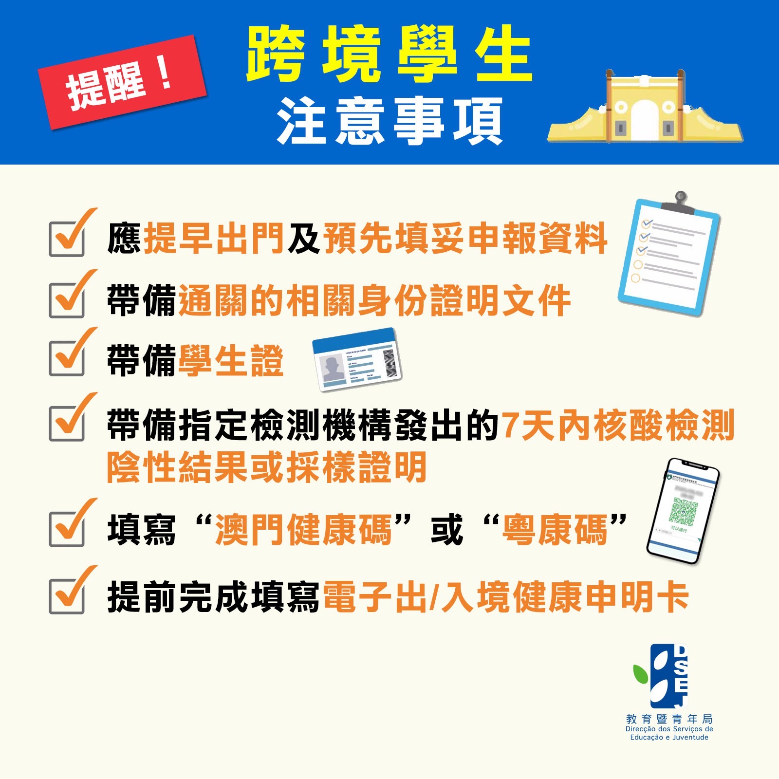 教青局重申,所有學生在復課前,必須身處澳門、珠海或中山滿14天,而跨境學生須每7天進行核酸測試後,可順利往返珠海、中山與澳門之間。學校亦須按照教青局及衛生部門發出的相關指引,做好相關衛生清潔等防疫措施。