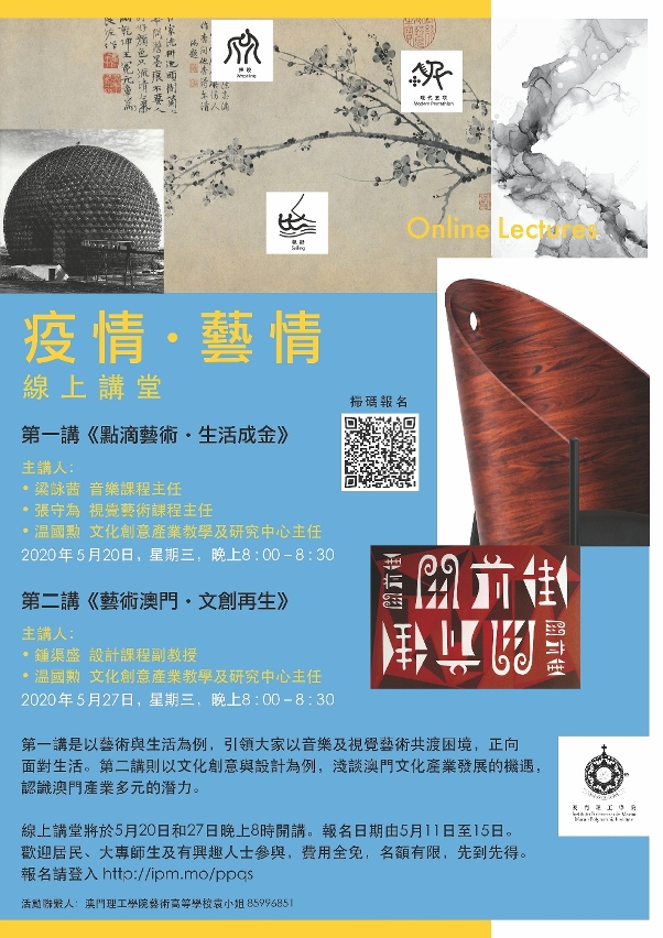 線上講堂將於5月20日和27日晚上8時開講。報名日期由5月11日至15日,歡迎居民、大專師生及有興趣人士參與,費用全免,名額有限,先到先得。報名請登入網頁:http://ipm.mo/ppqs。如有垂詢可致電8599 6851與藝術高等學校袁小姐聯絡。