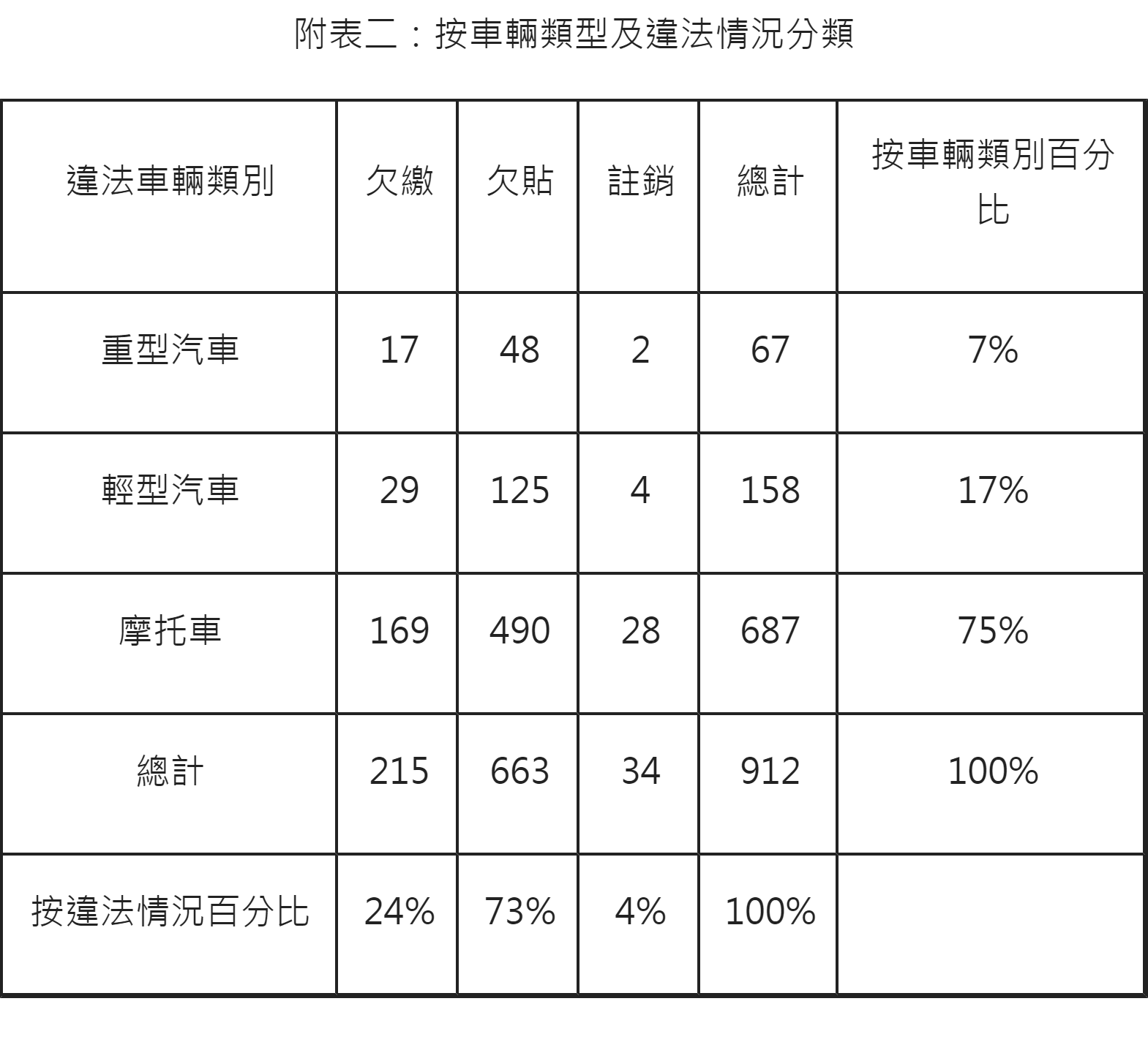 按車輛類型及違法情況分類見附表二