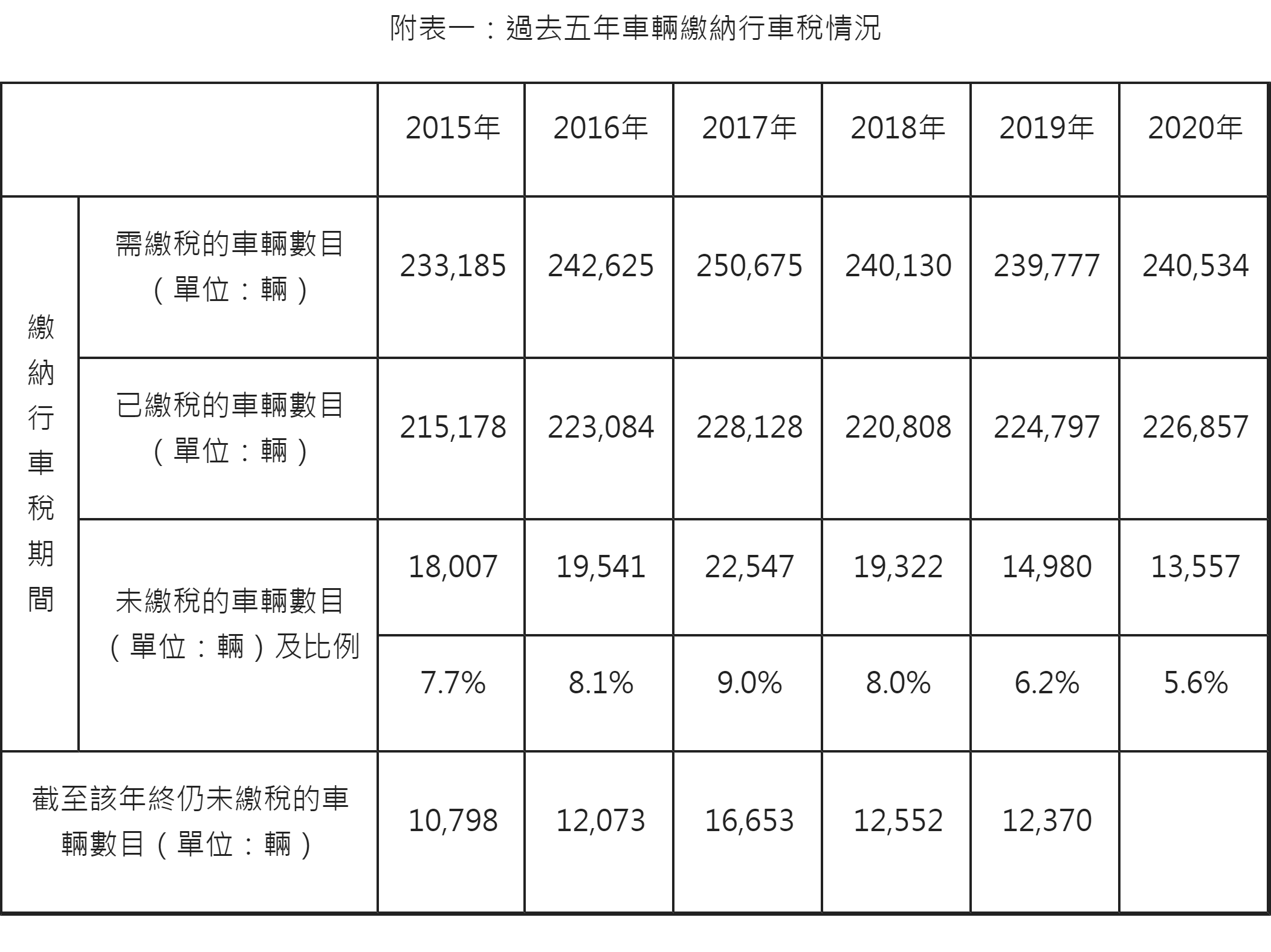 過去五年車輛繳納行車稅情況見附表一