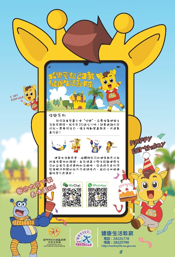 今年適逢健康生活教育20周年的大日子,社工局預防藥物濫用處將於下半年繼續推出 “哈樂飛越20載 健康生活創未來” 的系列活動,詳情請留意澳門禁毒網www.antidrugs.gov.mo及健康生活教育網 healthylife.ias.gov.mo 的最新資訊。
