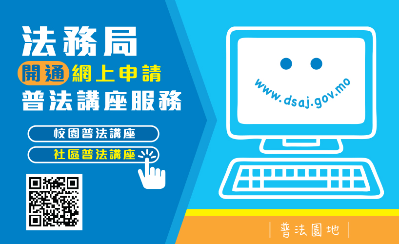 為提供更多便利渠道,自5月25日起,法務局開通網上申請普法講座系統,學校及社團如有需要申請法務局舉辦普法講座,除可繼續以電話或函件方式申請外,更可透過本局網頁24小時在綫辦理有關申請;申請人只需登入“澳門公共服務一戶通”帳戶,填寫有關講座的主題、日期、時間等基本資料後,即可在網上直接提交申請。法務局在獲取申請資料後,將按具體情況作出安排,並將安排結果以短訊通知申請者,過程十分簡便。詳情可參閱法務局網頁,如有查詢,可致電法務局法律推廣及公共關係廳 8795 7611(馬先生)或8795 7181(温小姐)。