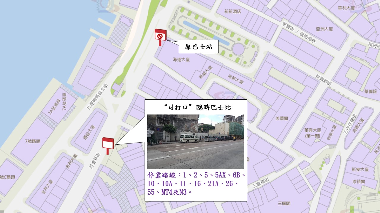 因應城市景觀美化計劃,市政署開展舊區建築物外牆油漆工程,配合施工,5月28日(周四)至6月21日(周日),河邊新街及司打口部份路段實施有限度通車,其間“司打口”巴士站臨時往李加祿街方向遷移約100米,詳情請參閱附表。市政署及交通事務局呼籲公眾留意。