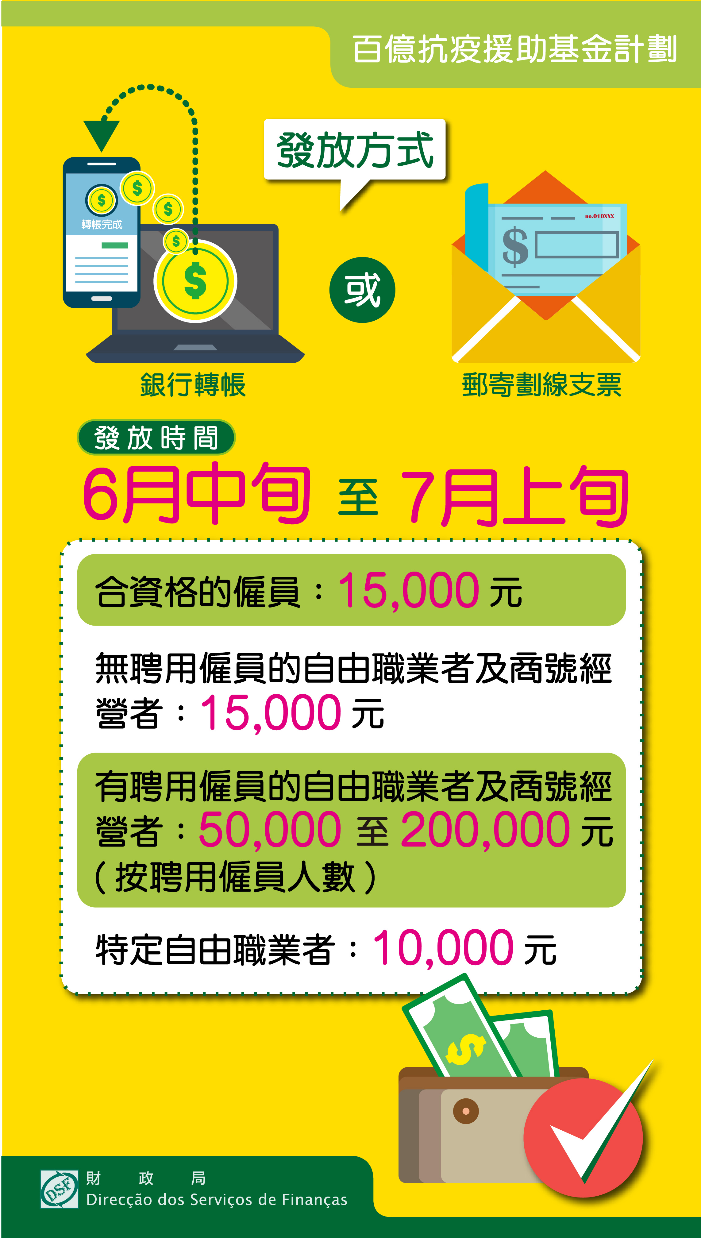 僱員及無聘用僱員的自由職業者,如曾以銀行轉帳方式收取本年度的現金分享款項,又或曾登記以銀行轉帳方式收取由財政局發放的給付金,其援助款項將採用銀行轉帳方式,於2020年6月16日存入其已登記的個人帳戶內。