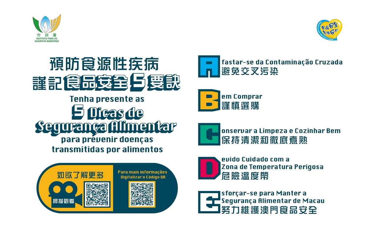 市政署藉著六月七日「世界食品安全日」之際,於食品安全資訊網增設專題網頁,讓社會大眾瞭解活動設立目的及意義,同時學習「食品安全五要訣ABCDE」的詳細內容,當中包括:避免交叉污染(Avoid Cross Contamination)、謹慎選購(Buy Right)、保持清潔和徹底煮熟(Clean and Cook Completely)、注意危險温度帶(Danger Temperature Zone),並共同致力維護澳門食品安全(Efforts to maintain Macao food safety)等重要概念。市政署為「食品安全五要訣ABCDE」設多語文版本,亦持續透過派發宣導單張以及動畫短片等,讓不同持分者輕鬆學習、掌握食安控制要點,確切地應用在日常生活及生產經營中,強化公眾的食安意識及食品業界的食安管理成效,降低食品安全的風險。