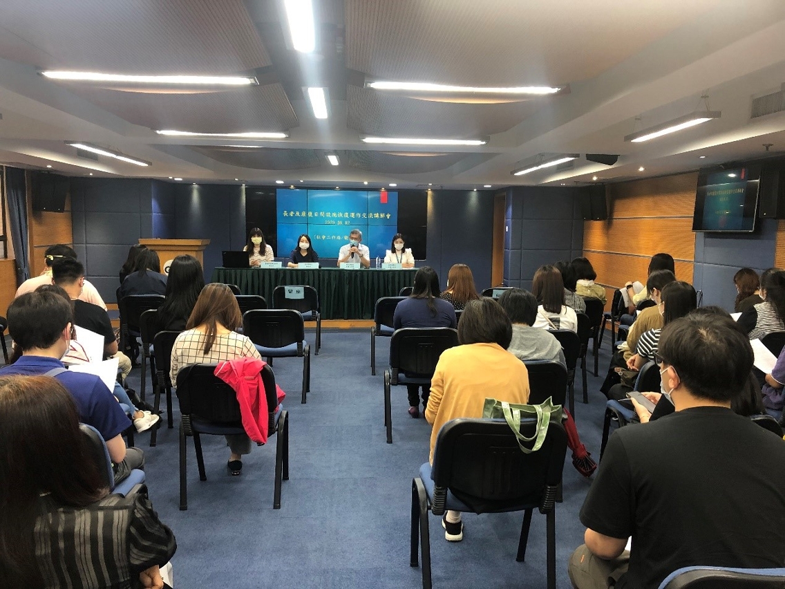 另於6月2日,社會工作局與衛生局合辦了 “長者及康復日間設施恢復運作交流講解會”,對象為即將恢復運作的19間長者及康復服務日間設施人員,共40人參與。會上,衛生局疾病預防控制中心梁美寶護士與黃穎雯高級技術員,以及社會工作局社會設施准照及監察處林若曦護士,介紹了新型冠狀病毒肺炎的疾病資訊、本澳的疫情發展情況、設施管理的防疫措施、復運期間的注意事項等。與會者踴躍提問,並互相分享復運前的準備工作。