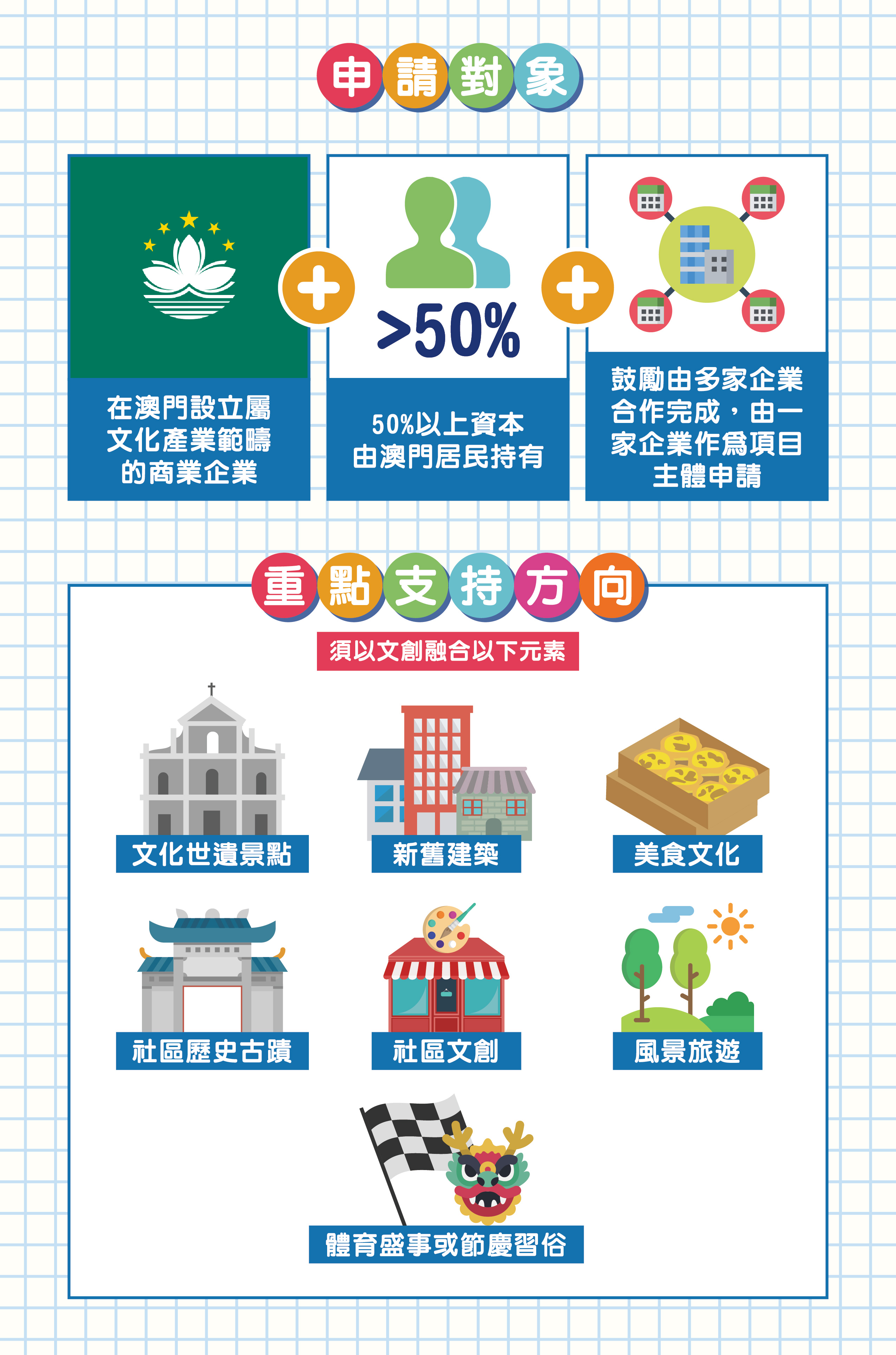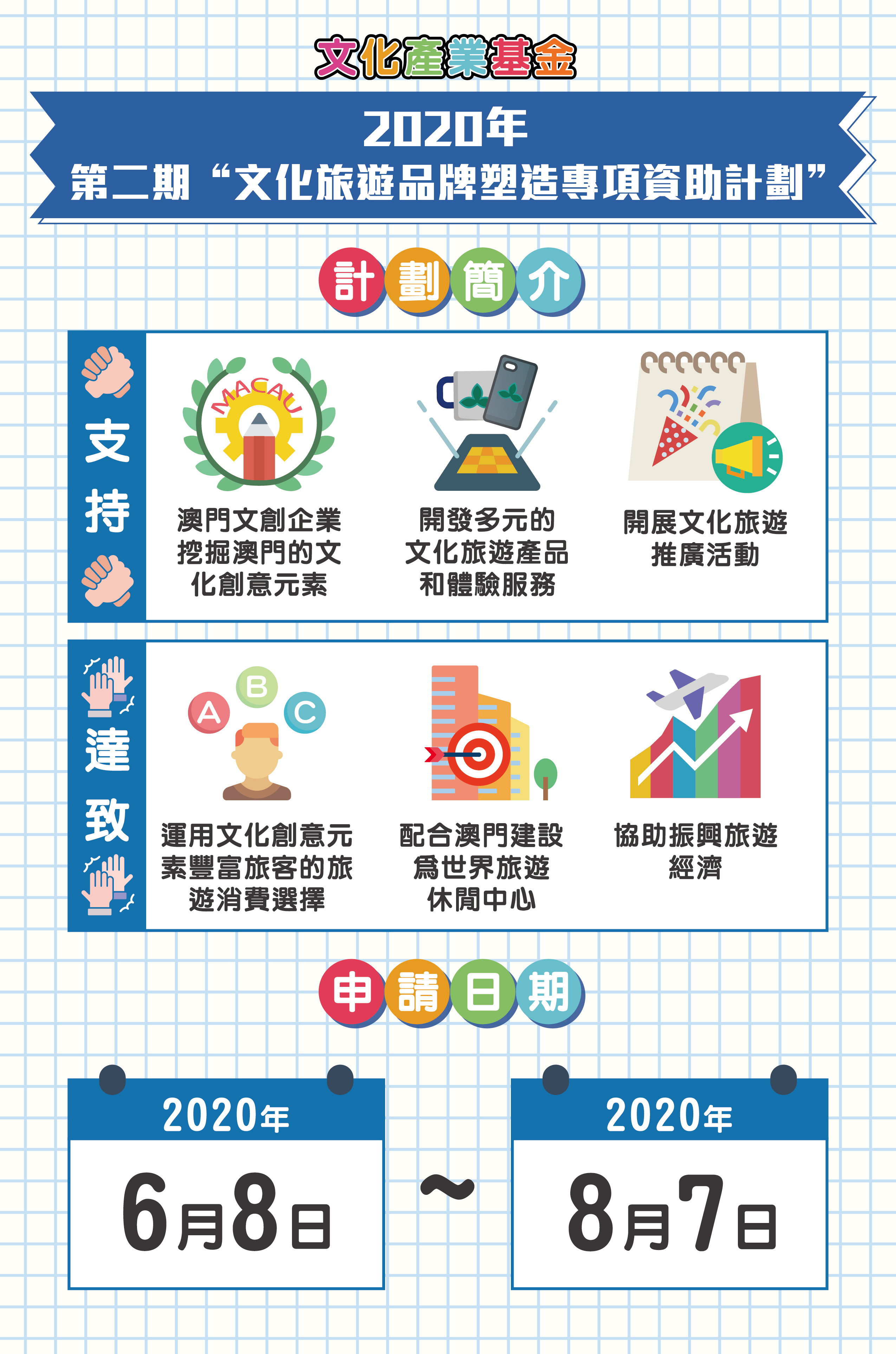 “文化旅遊品牌塑造專項資助計劃”的目的是鼓勵澳門的文創企業進行跨界合作,以文創融合世遺景點、有文化價值的建築、美食、社區歷史古蹟、體育盛事或節慶習俗等元素,開發文化旅遊產品、文化體驗服務及開展文化旅遊推廣活動。