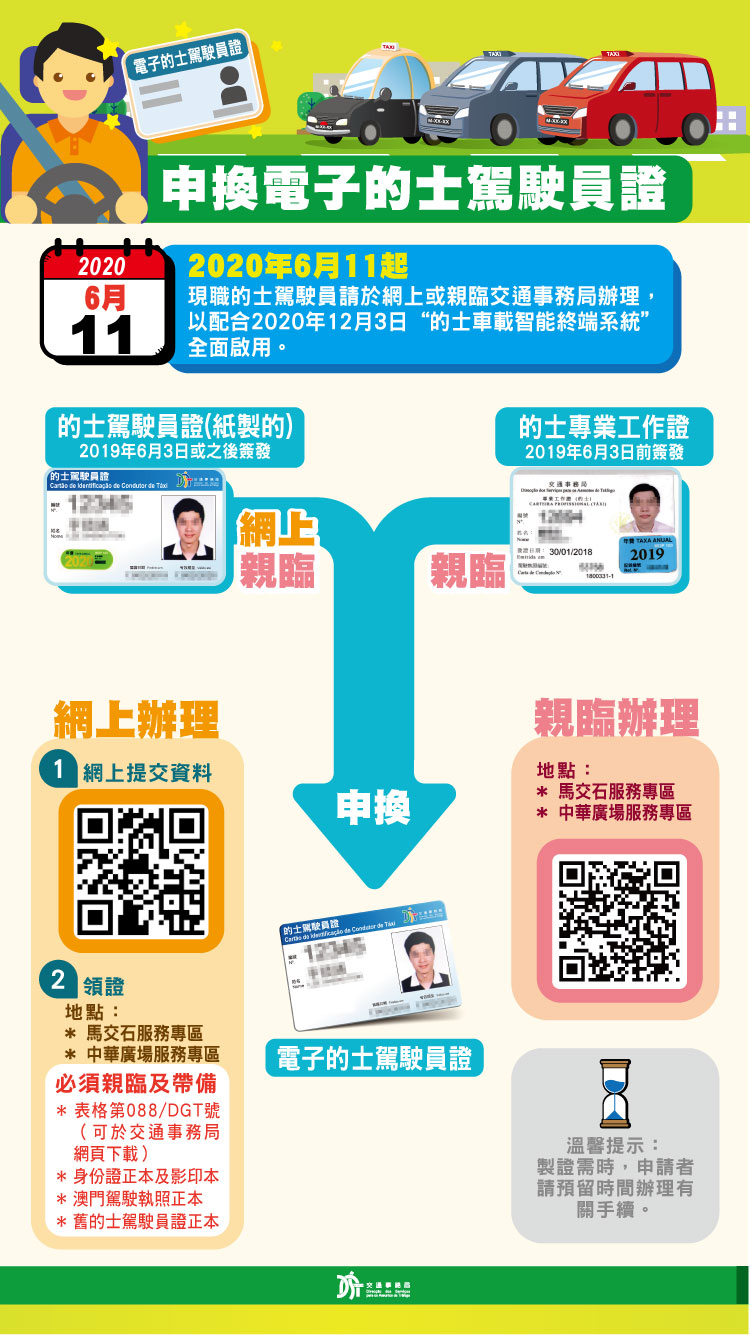 現職的士駕駛員須申換“電子的士駕駛員證",交通事務局由6月11日(周四)起接受辦理,以配合2020年12月3日“的士車載智能終端系統”全面啟用。